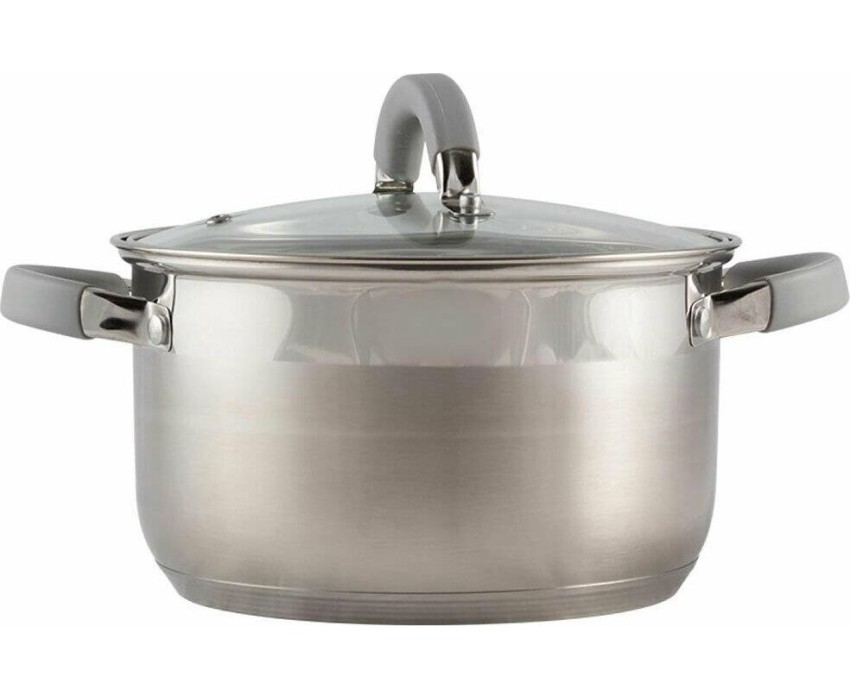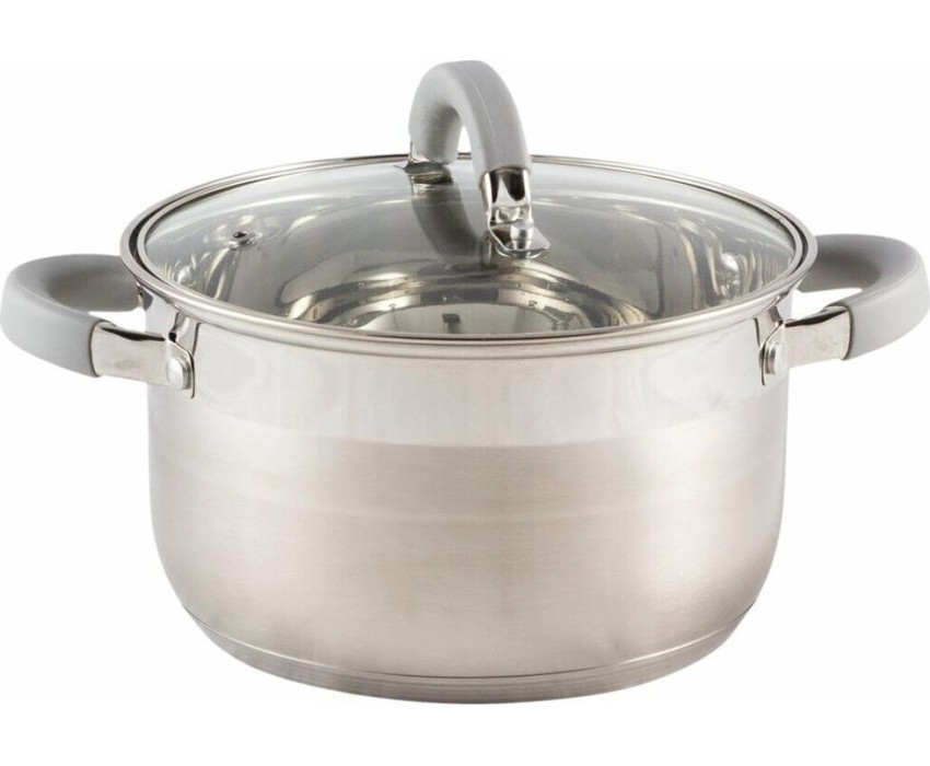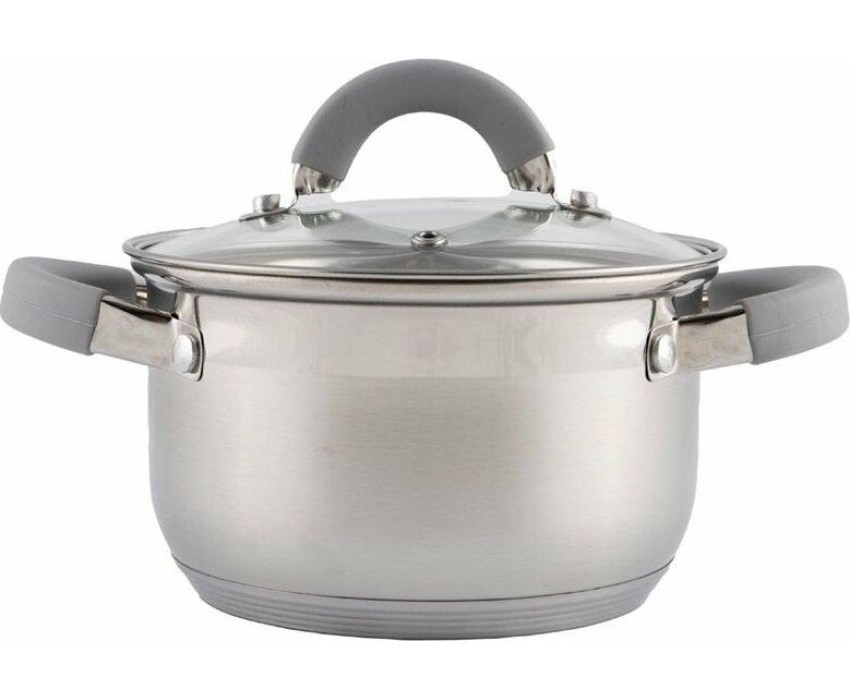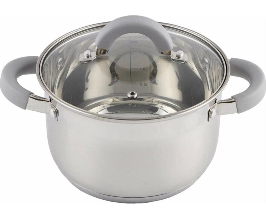 Кастрюля Felicità, объем 2 л, из нерж стали с крышкой из жаропрочного стекла, размер 16*10 см Материал: нерж сталь № 201, жаропрочное стекло, силикон, алюминий, нерж сталь № 430, железо. Размер: 16*10 см/Объем: 2 л. Толщина стенок — 0,5 мм, 5-слойное капсулированное дно/толщина дна 3,5 мм (0,5 мм нерж сталь 201+0,5 мм алюминий + 1 мм железо +0,5 мм алюминий + 0,5 мм 430 сталь). Подходит для всех типов плит. Зеркальная полировка внутри. Отметки литража. Внешний корпус — смешанный тип полировки (матовый с зеркальной полосой в верней части). Крышка С-типа из жаропрочного стекла с отверстием для выпуска пара. Полые ручки из нерж стали с покрытием из силикона. Инд упаковка: термоусадка + цветной круглый вкладыш + пакет. Диаметр дна: 13,5 см Диаметр крышки: 16,5 см