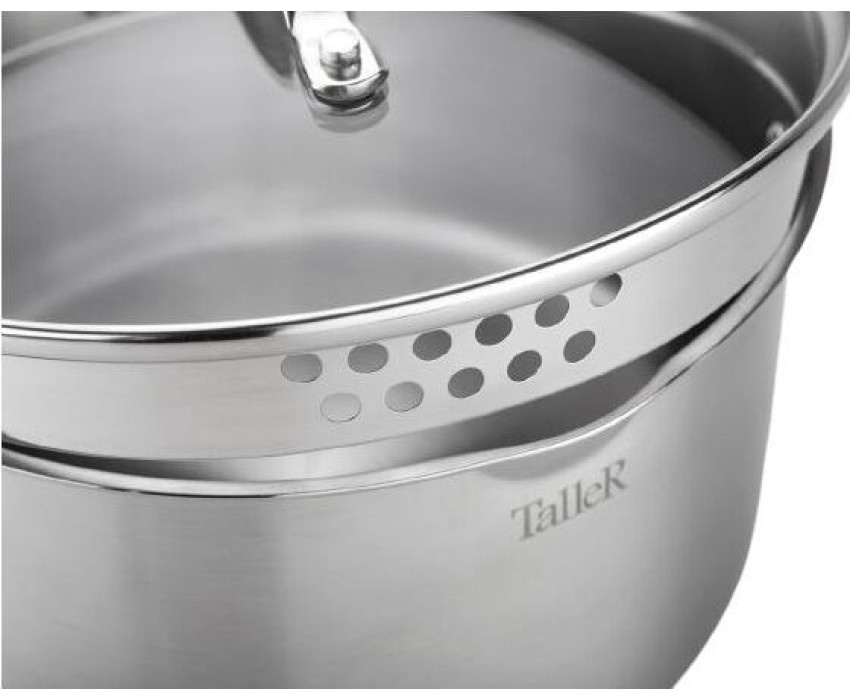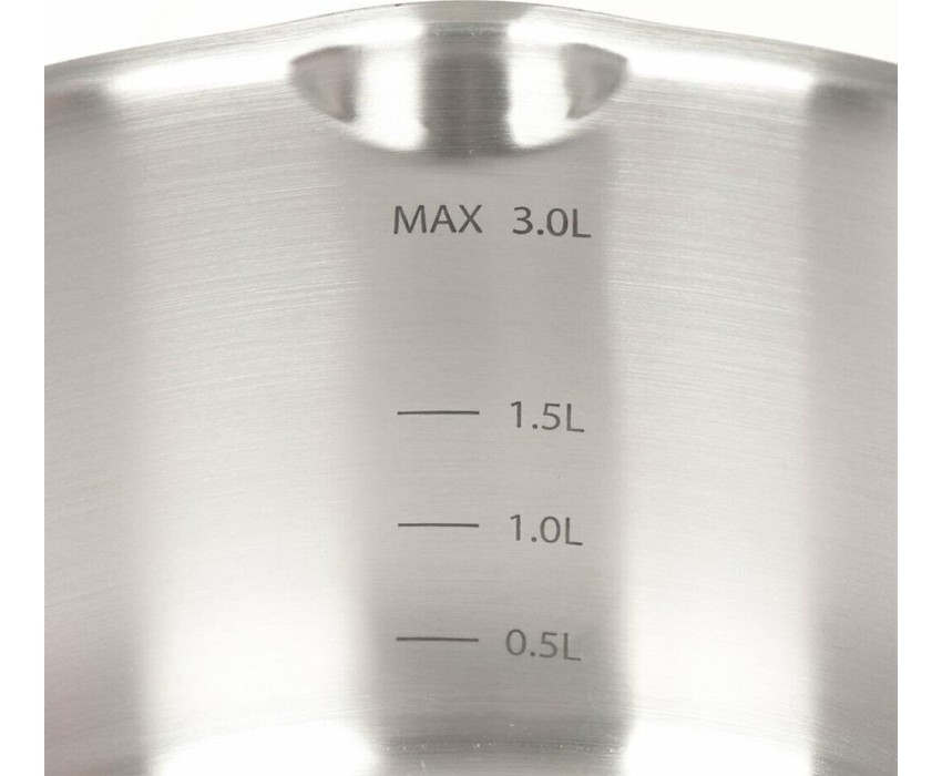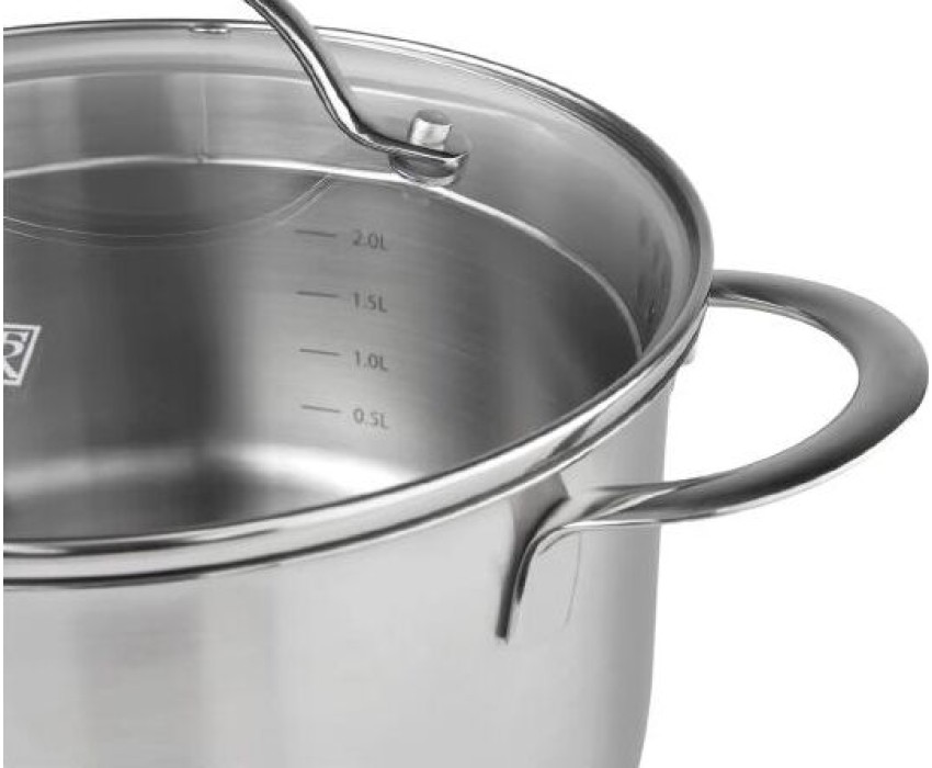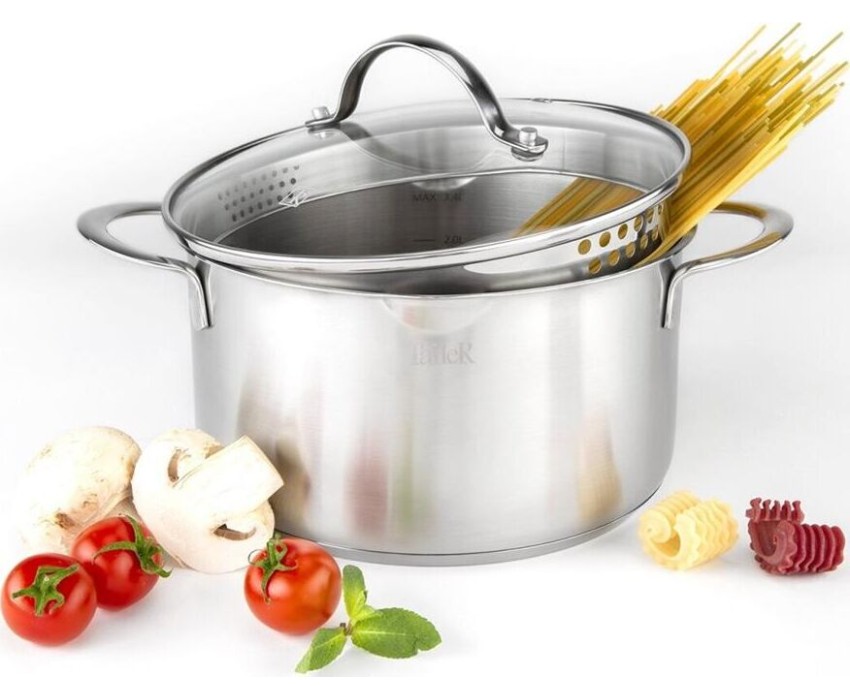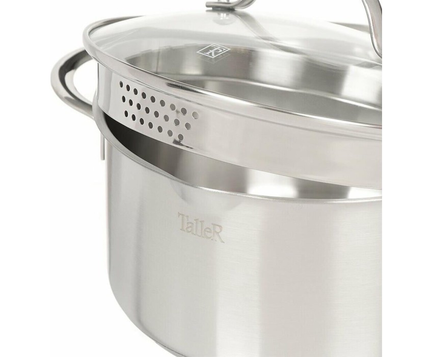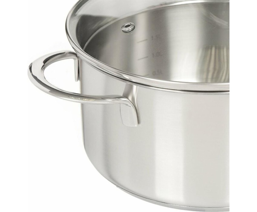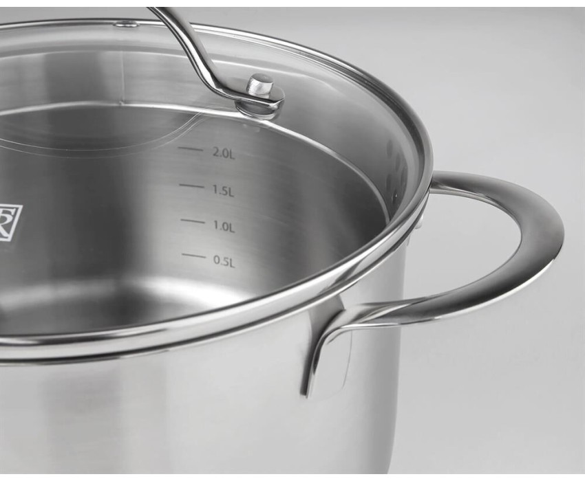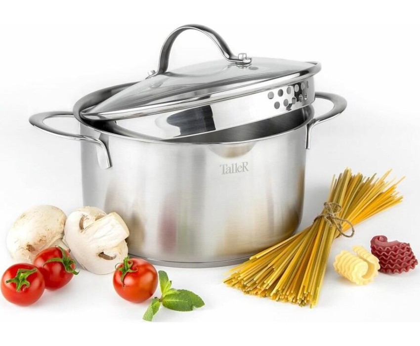Сталь 18/10, толщина дна/стенки 4,0/0,6мм, сливной носик, крышка с перфорацией для удобного слива жидкости. Ручки из нержавеющей стали. Отметки емкости на внутренней стенке кастрюли, матовая внутренняя и внешняя полировка. Упаковка: цветная коробка. Разме