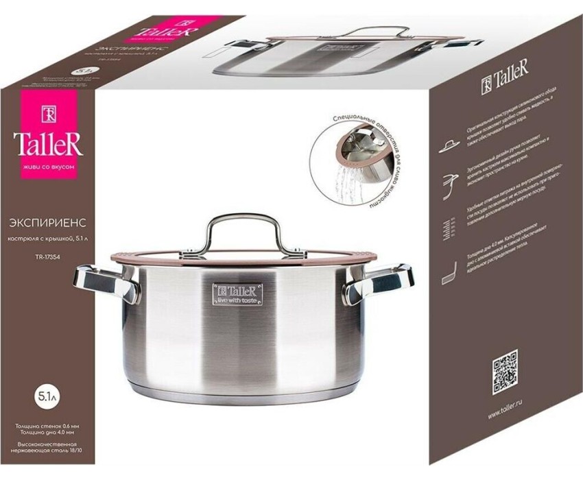 Кастрюля Experience с крышкой, 5,1 л Материал: нержавеющая сталь 18/10 Комбинированная крышка из закаленного стекла с силиконовым ободом оригинальной конструкции , цвет крышки 409С Удобные отметки литража на внутренней поверхности посуды Капсулированное д