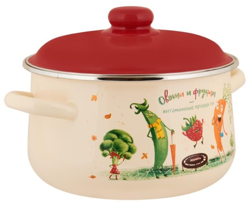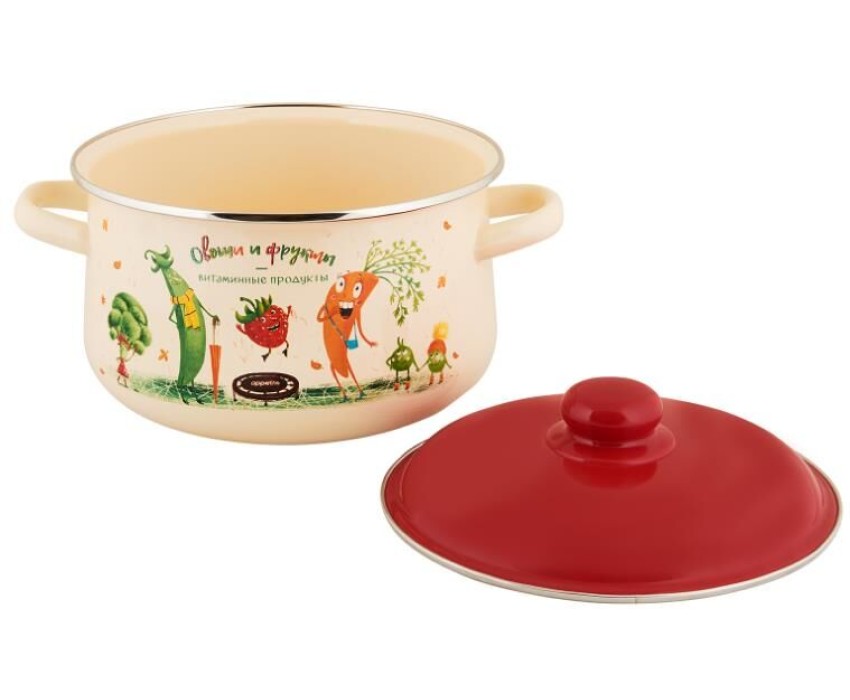 Объем, л./размер, см: 5.5 л Материал: эмалированная сталь Коллекция/серия: Веселые овощи Толщина дна: 0.8 Источник тепла: Все виды плит Тип упаковки: коллективная Крышка: эмалированная Внутреннее покрытие: эмаль Внешнее покрытие: эмаль