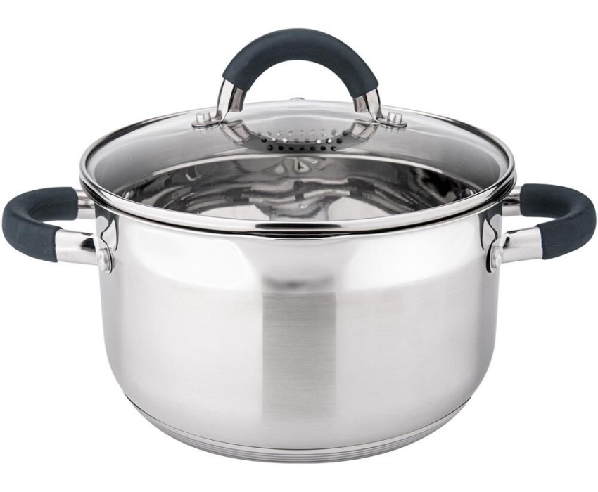 Кастрюля из нержавеющей стали со стеклянной крышкой с отверстиями для слива воды. Кастрюля с двуми носиками. Ручки полые просиликоненные. Толщина корпуса 0,5 мм. Упаковка: цветная коробка. Подходит ко всем типам плит. Можно мыть в посудомоечной машине.