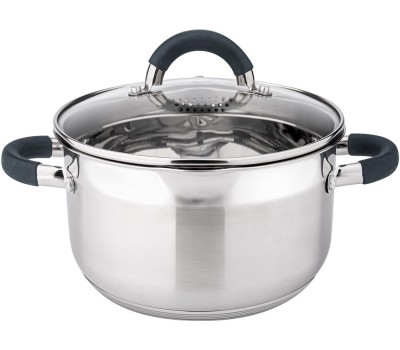 Кастрюля из нержавеющей стали со стеклянной крышкой с отверстиями для слива воды. Кастрюля с двуми носиками. Ручки полые просиликоненные. Толщина корпуса 0,5 мм. Упаковка: цветная коробка. Подходит ко всем типам плит. Можно мыть в посудомоечной машине.