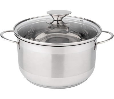 Кастрюля из нержавеющей стали. Ручки проволочные нержавеющие, со стеклянной крышкой. Толщина корпуса 0,5 мм. Упаковка: круглый цветной вкладыш, термоусадочная пленка. Подходит ко всем типам плит. Можно мыть в посудомоечной машине.