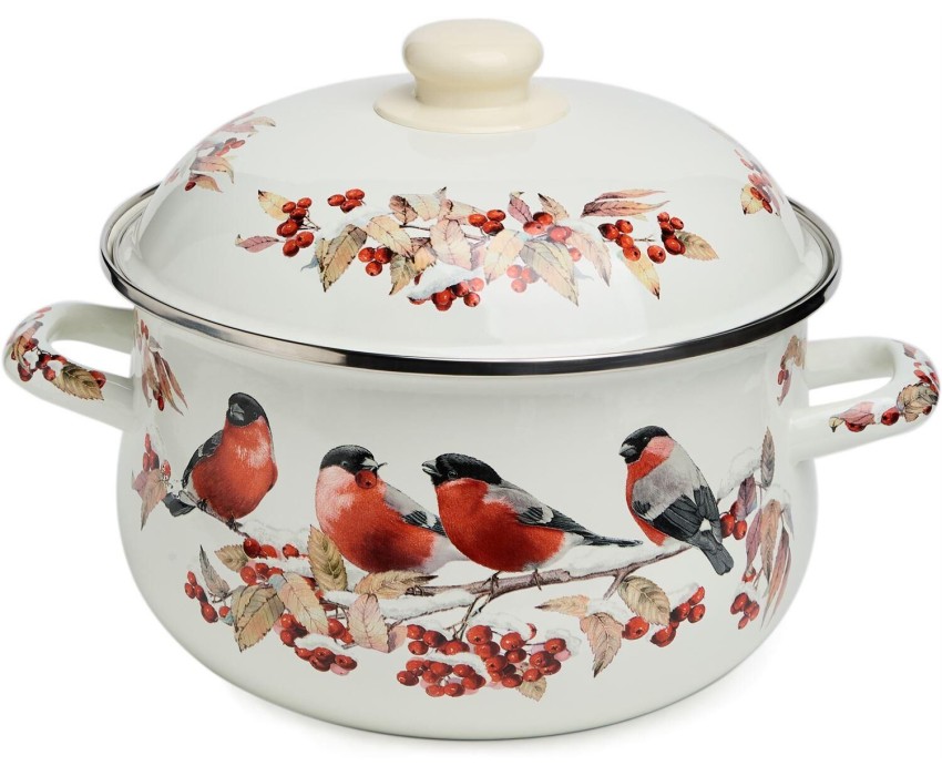 Эмалированная посуда обладает целым рядом преимуществ: * Эмалированная посуда не требует особого ухода и легко моется * Эмалированная посуда гигиенична - не удерживает болезнетворных микробов и бактерий * На поверхности эмалированной посуды не остается запаха пищи * В эмалированной посуде можно не только готовить, но и хранить приготовленные блюда, причем довольно долгое время * Подходит для всех типов плит, включая индукционные * Можно мыть в посудомоечной машине * Толщина стенок 0,5мм • Посуда проходит 3 этапа обжига, эта технология позволяет сохранить яркость расцветок деколи, а также придает прочность эмалированной посуде • Все деколи наносятся в ручную, а затем обжигаются при температуре около 800 С Стильный и нежный декор эмалированной посуды украсит любую кухню. Высота кастрюли 13 см, диаметр 22 см, диаметр дна 14 см и ширина с ручками 28 см.