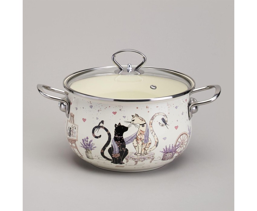 Кастрюля AGNESS КАСТРЮЛЯ ЭМАЛИРОВАННАЯ СО СТЕКЛЯННОЙ КРЫШКОЙ СЕРИЯ "LAVENDER CATS", 3,8 Л ДИА. 22СМ 943-078