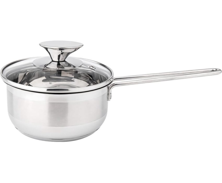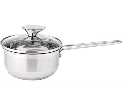 Ковш из нержавеющей стали. Ручки проволочные нержавеющие, со стеклянной крышкой. Толщина корпуса 0,5 мм. Упаковка: круглый цветной вкладыш, термоусадочная пленка. Подходит ко всем типам плит. Можно мыть в посудомоечной машине.