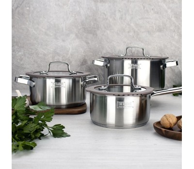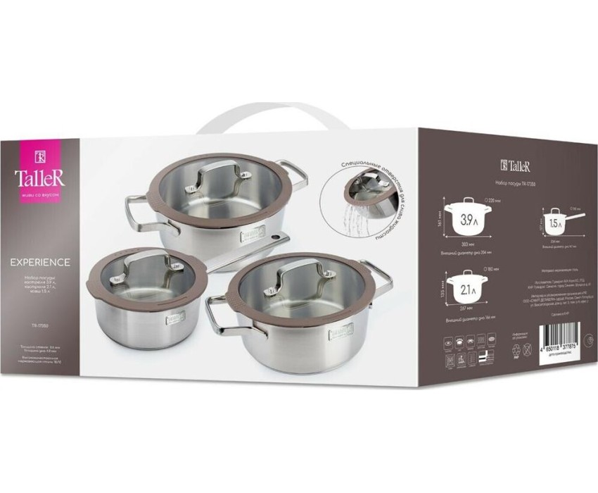 Набор посуды Experience, 6 предметов. Состав набора : кастрюля 3,9 л с крышкой, кастрюля 2,1 л с крышкой, ковш 1,5 л с крышкой Материал: нержавеющая сталь 18/10 Комбинированная крышка из закаленного стекла с силиконовым ободом оригинальной конструкции,