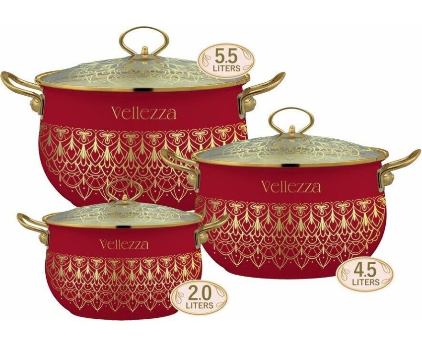 Набор кастрюль VELLEZZA RED 6 предметов: 3 эмалированные кастрюли 3 стеклянные крышки Размеры: Ø 18 | h-11.7 см | 2.0 л Ø 22 | h-14.2 см | 4.5 л Ø 24 | h-15.0 см | 5.5 л Ø 28 | h-16.5 см | 8.5 л Внутреннее белое эмалевое покрытие Внешнее цветное эмалевое покрытие с декоративным орнаментом Защитный металлический обод вокруг кастрюли Толщина стенок посуды 0.9 мм Ручки из нержавеющей стали Цельнолитой бесшовный корпус Подходит для всех видов плит, включая индукционные
