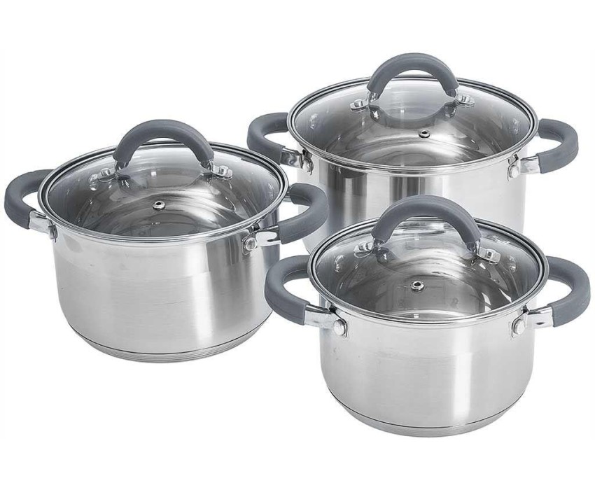 В наборе 6 предметов: кастрюля со стеклянной крышкой 16×10,5см; 2,2л кастрюля со стеклянной крышкой 18×11,5см; 3,0л кастрюля со стеклянной крышкой 20×12,5см; 4,0л Толщина стали 0,5 мм Набор кастрюль из высококачественной нержавеющей стали со стеклянными крышками Специальная форма, исключающая скопление остатков пищи и жира Эргономичный дизайн Термосберегающее дно: пятислойное дно с повышенной термоотдачей Быстрый нагрев пищи, длительное удержание тепла Минимальные потери минеральных веществ, витаминов и вкусовых качеств Подходят для использования на всех типах кухонных плит, включая индукционные Подходят для мытья в посудомоечной машине Серия: Profi Упаковка: цветная коробка