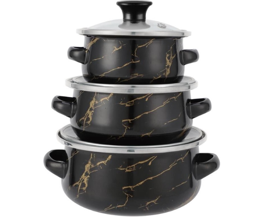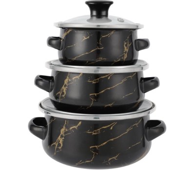 Набор посуды из 6 предметов. Кастрюля: 0,5л.; Стеклянная крышка: 12см.; Кастрюля: 0,7л.; Стеклянная крышка: 14см.; Кастрюля: 1,1л.; Стеклянная крышка: 16см.; 3-х слойное внешнее эмалированное покрытие; 3-х слойное внутреннее эмалированное покрытие; Подходит для индукционных плит