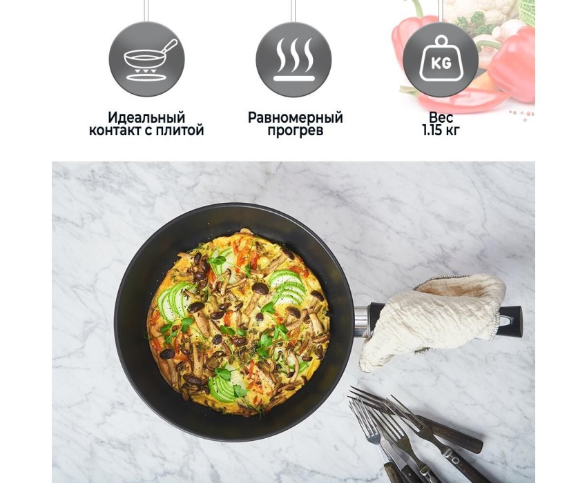 Общий диаметр 28 см Диаметр дна 22 см Толщина дна 6 мм Толщина стенок 4 мм Высота 7 см Тип универсальная сковорода Материал литой алюминий Форма круглая Наличие ручки 1 основная и дополнительная Материал ручки бакелит Покрытие и дно Антипригарное покрытие Особенности использования Возможность мыть в посудомоечной машине