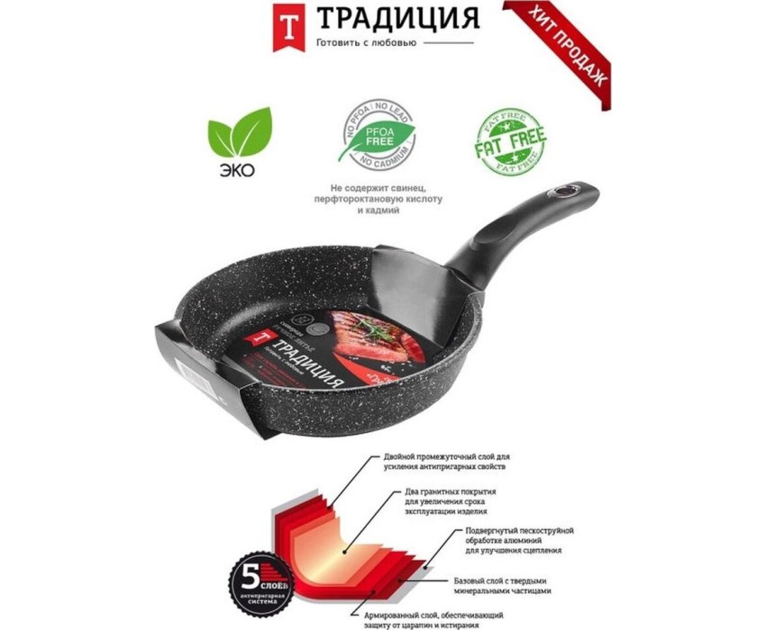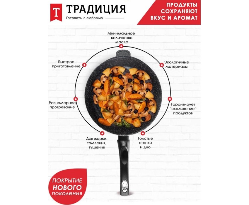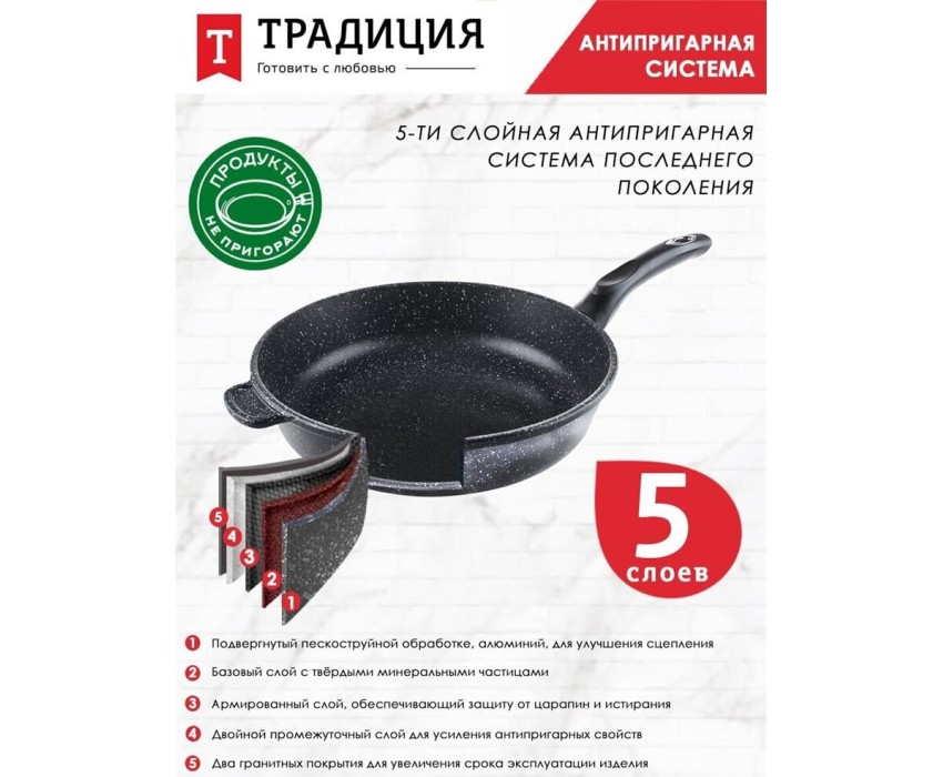 Объем, л./размер, см: 28 см Материал: литой алюминий Коллекция/серия: Гранит Торговая марка: Традиция Толщина дна: 6 Толщина стенок: 4.2 Источник тепла: Все виды плит, кроме индукционной Тип упаковки: цветной рукав Внутреннее покрытие: антипригарное покрытие Pfluon Внешнее покрытие: антипригарное покрытие Pfluon
