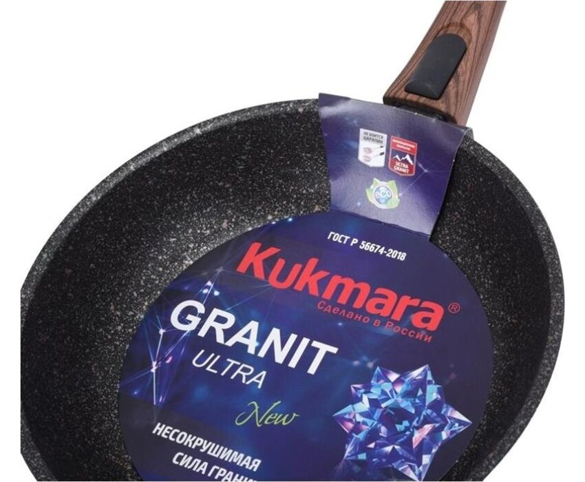 Объем, л./размер, см: 26см. Материал: литой алюминий Коллекция/серия: Granit ultra original. Торговая марка: Kukmara. Толщина дна: до 6мм. Толщина стенок: до 4.5мм. Ручка: съемная. Источник тепла: Все виды плит, кроме индукционной. Тип упаковки: цветной рукав. Внутреннее покрытие: Антипригарное мраморное покрытие нового поколения, усиленное сверхтвердыми частицами минералов. Внешнее покрытие: Декоративное износостойкое покрытие с отличной сопротивляемостью к высоким температурам. Можно мыть в посудомоечной машине.