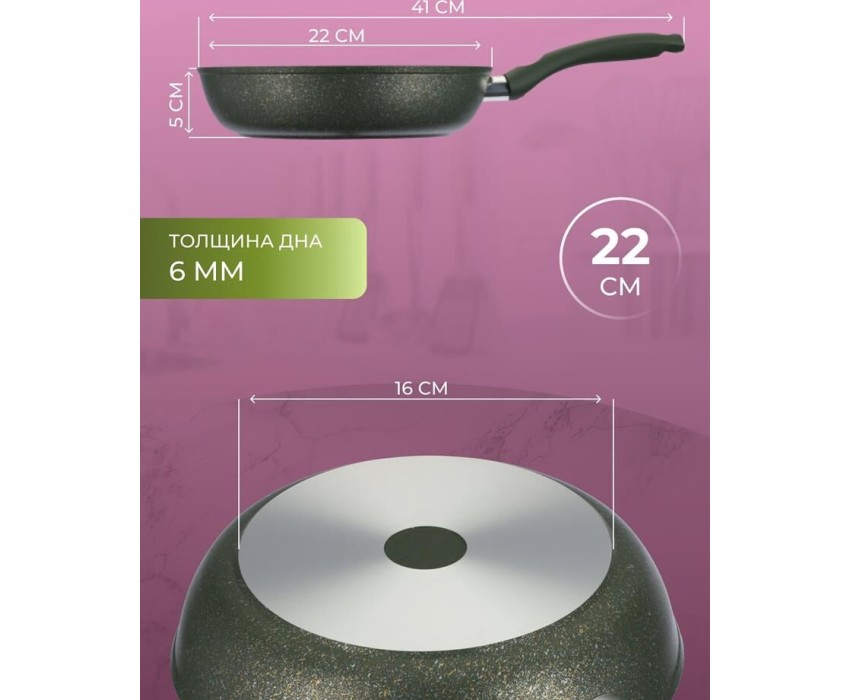 Сковорода а/пр литая 22см Trendy style malachite ТМ KUKMARA, изготовлена из литого алюминия толщина стенки- 4,5мм; Толщина дна- 6 мм. Подходит для всех типов плит, кроме индукционных. Можно мыть в посудомоечной машине. Произведено в РОССИИ.