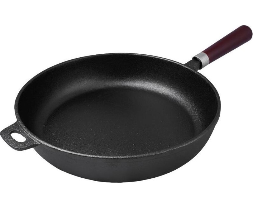 Сковорода чугунная глубокая 28см деревянная ручка, идеальная сковорода для приготовления любых блюд. Подходит для любых типов плит: газовых, индукционных, электрических, стеклокерамических. Нельзя мыть в посудомоечной машине. Преимущество чугуна - равномерный нагрев, что предотвращает пригорание пищи. Готовое блюдо достаточно долго будет сохранять свое тепло, избавив вас от необходимости дополнительного подогрева. Эргономичная рукоятка дополнена специальным отверстием для подвеса, что обеспечивает комфорт использования изделия. Небольшие углубления в стенках сковороды позволяют удобно слить из нее содержимое, не пачкая при этом поверхность стола. Во время мытья не рекомендуется применять чистящие средства с абразивными веществами, а также жесткие губки. Естественное антипригарное покрытие. Толщина дна 4 мм Высота стенок 6.5 см