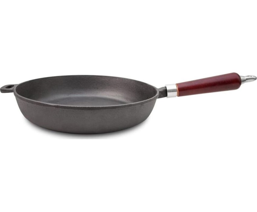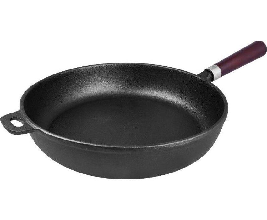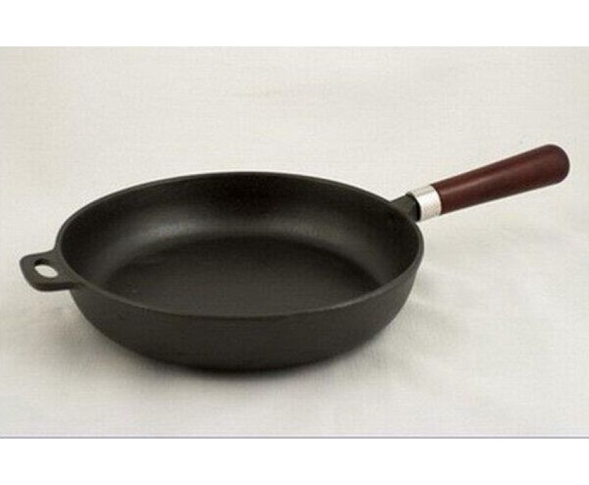 Сковорода чугунная глубокая 30см деревянная ручка, идеальная сковорода для приготовления любых блюд. Подходит для любых типов плит: газовых, индукционных, электрических, стеклокерамических. Нельзя мыть в посудомоечной машине. Преимущество чугуна - равномерный нагрев, что предотвращает пригорание пищи. Готовое блюдо достаточно долго будет сохранять свое тепло, избавив вас от необходимости дополнительного подогрева. Эргономичная рукоятка дополнена специальным отверстием для подвеса, что обеспечивает комфорт использования изделия. Небольшие углубления в стенках сковороды позволяют удобно слить из нее содержимое, не пачкая при этом поверхность стола. Во время мытья не рекомендуется применять чистящие средства с абразивными веществами, а также жесткие губки. Естественное антипригарное покрытие. Диаметр верха 30 см Толщина дна 4 мм Высота стенок 6.5 см Толщина стенок 3.9 мм