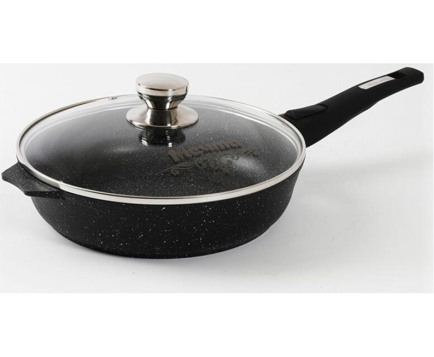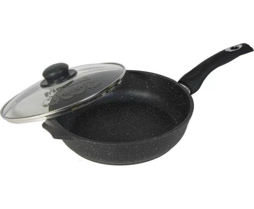 Сковорода 26см с антипригарным покрытием, несъемной ручкой и стеклянной крышкой серии "Гранит black". Подходит для всех типов плит, кроме индукционных. Можно использовать в посудомоечной машине.