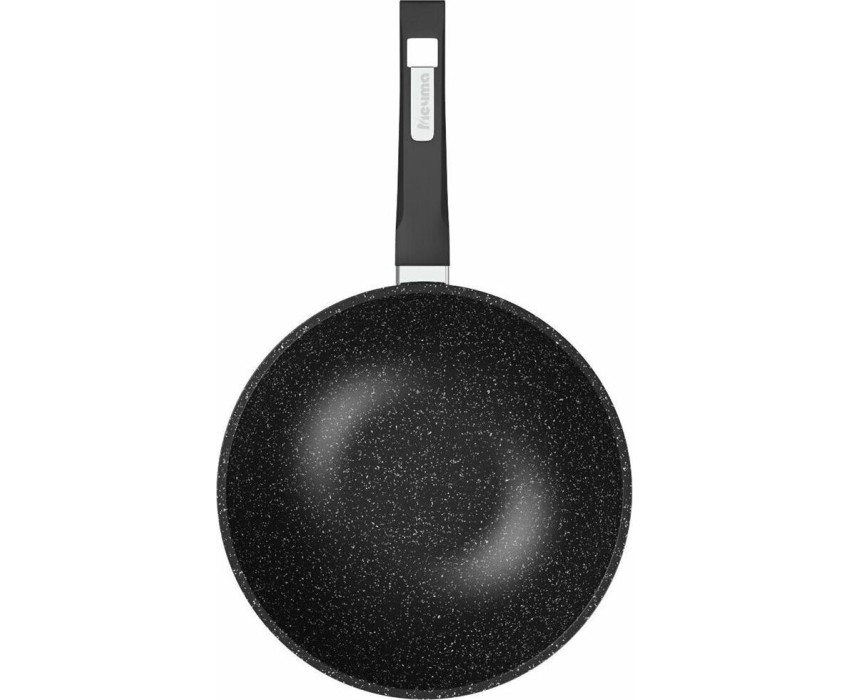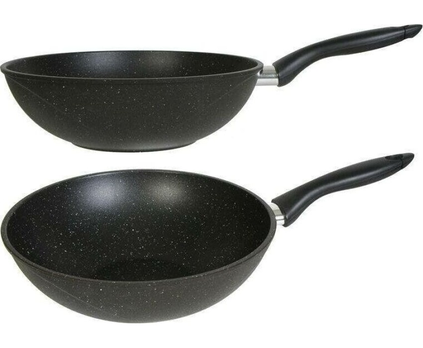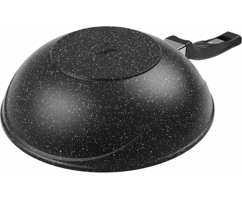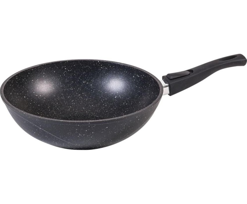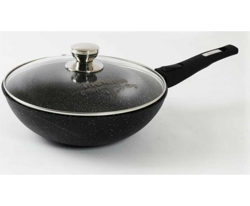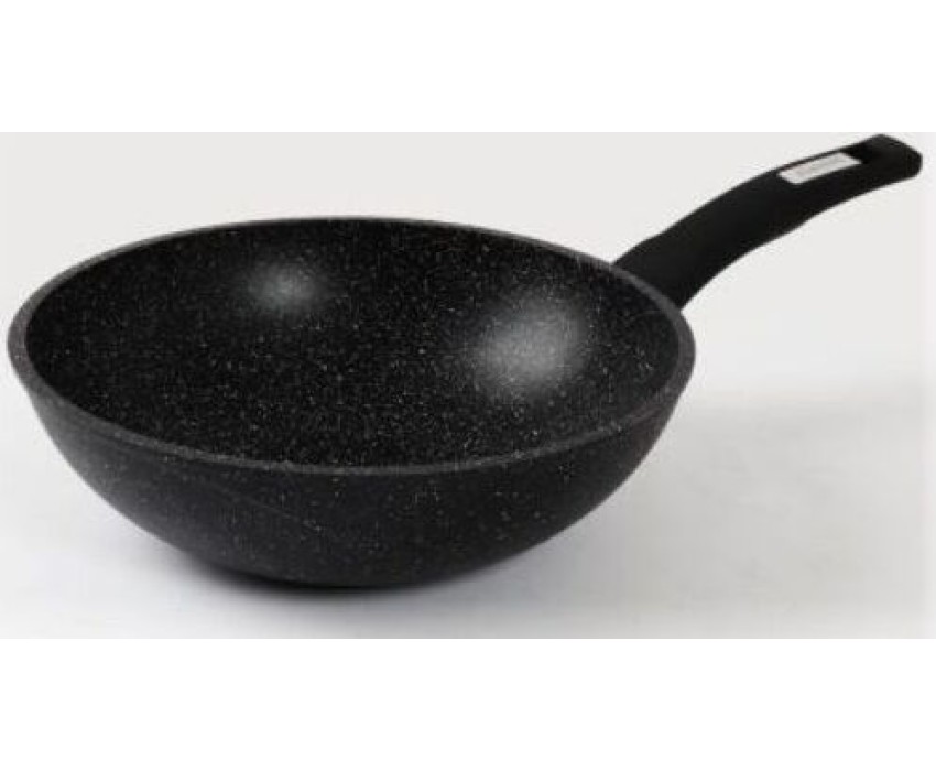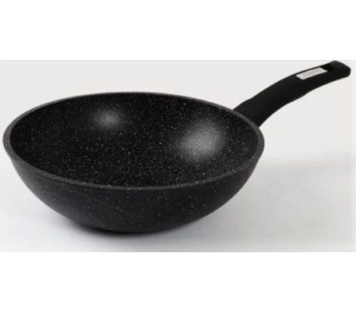 Сковорода ВОК 28см с антипригарным покрытием и несъемной ручкой серии "Гранит black". Подходит для всех типов плит, кроме индукционных. Можно использовать в посудомоечной машине.