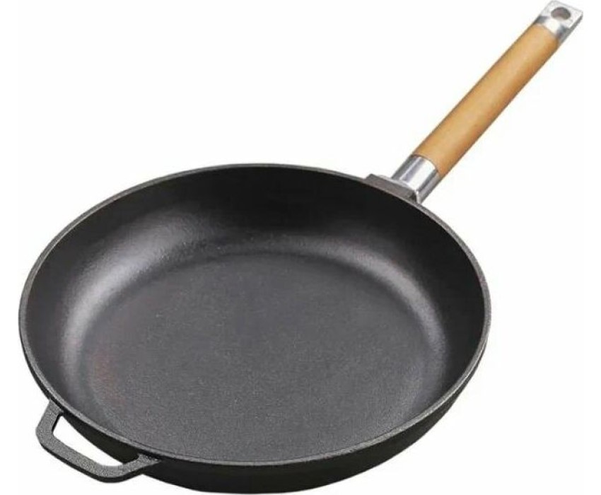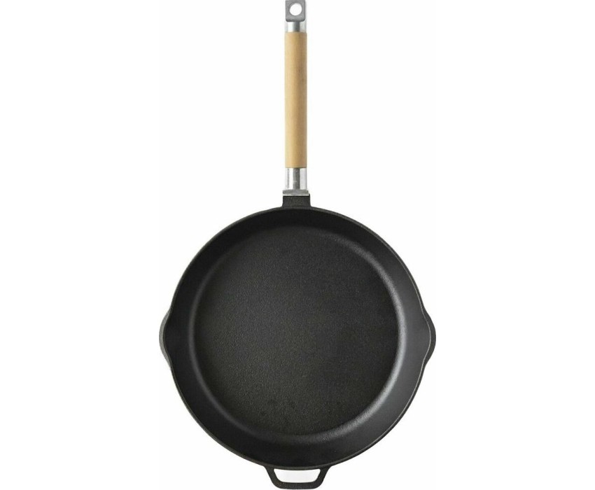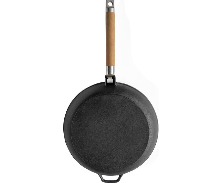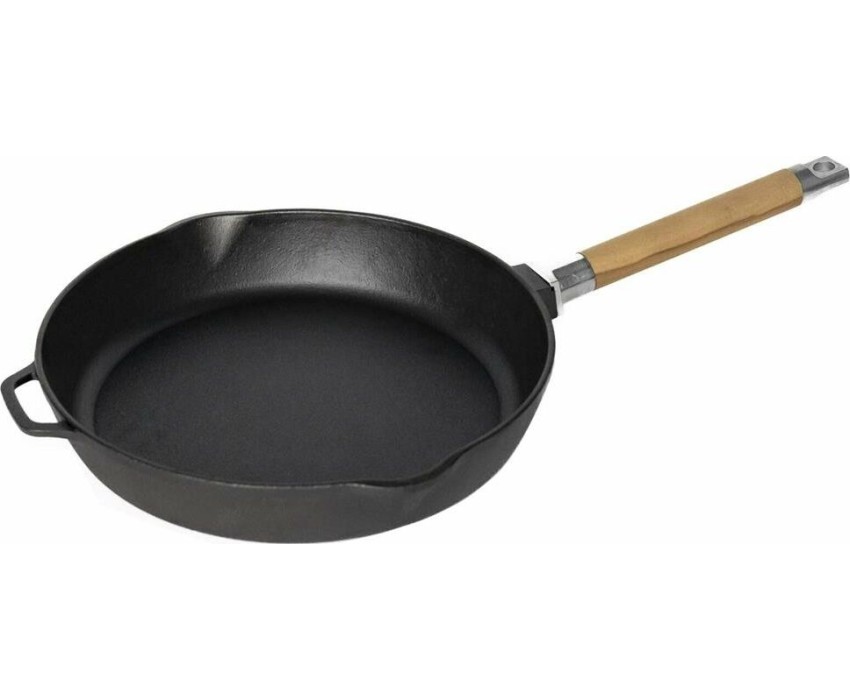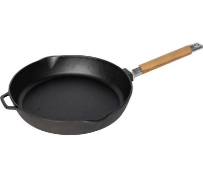 Сковорода изготовлена из натурального экологически безопасного чугуна. Чугун является одним из лучших материалов для производства посуды. Сковороду можно нагревать до высоких температур, она практична, не выделяет токсичных веществ, обладает высокой теплоемкостью и способна служить десятилетиями. Сковорода оснащена съемной деревянной ручкой. При помощи вращательного движения ручка снимается и прикручивается. Подходит для всех типов плит, включая индукционные. Нельзя мыть в посудомоечной машине. Диаметр сковороды по верхнему краю: 28 см. Высота стенки: 6,5 см. Длина ручки: 21 см.