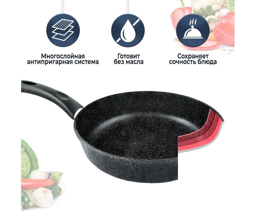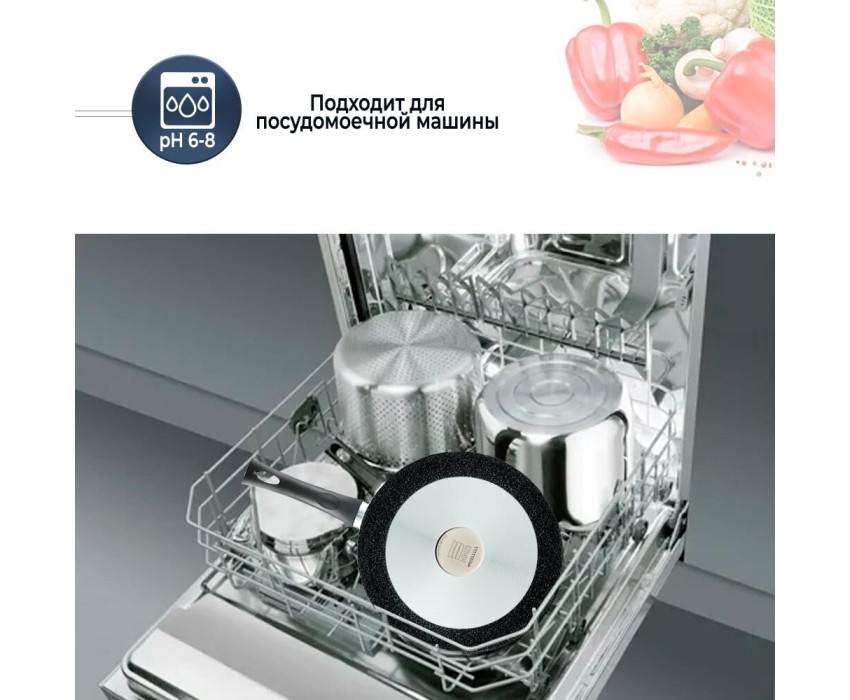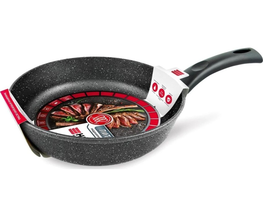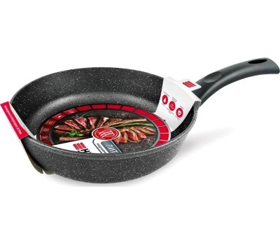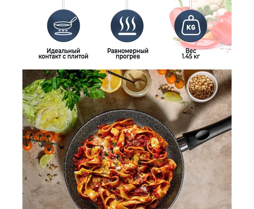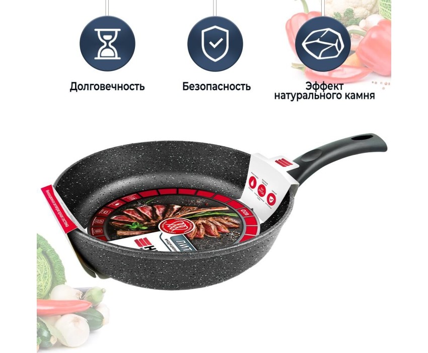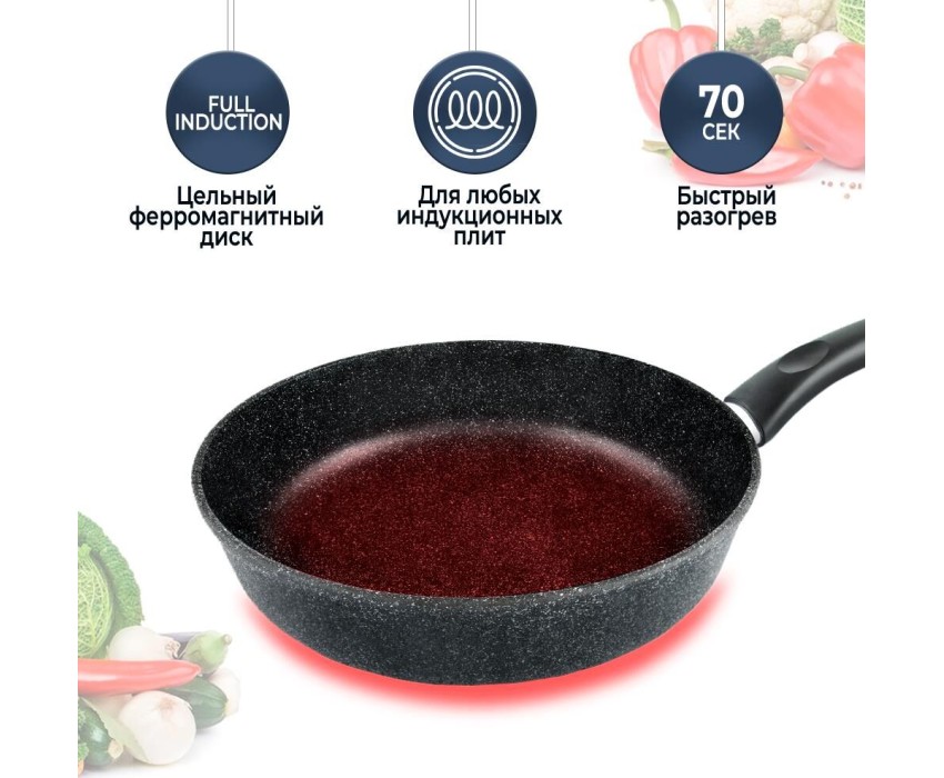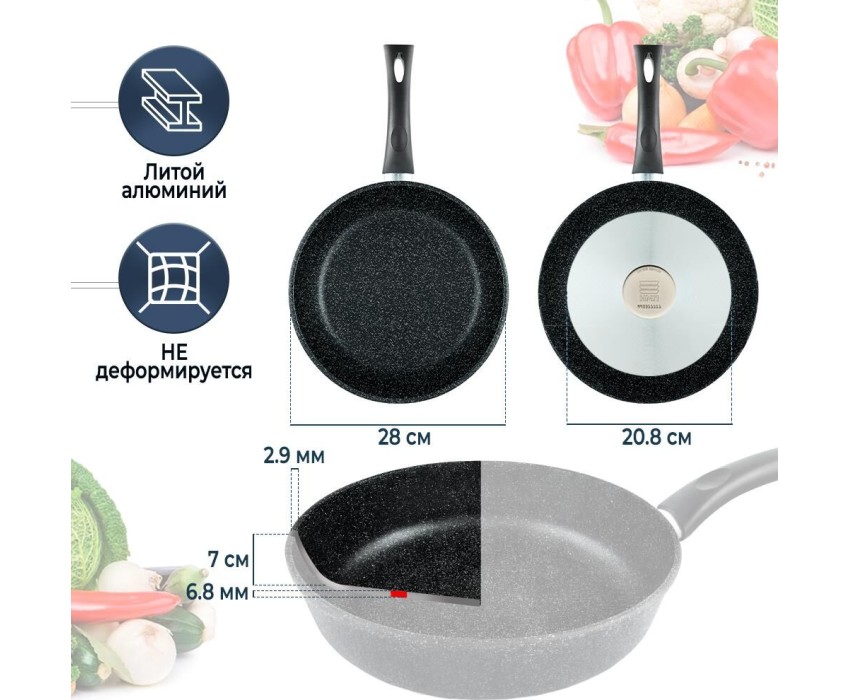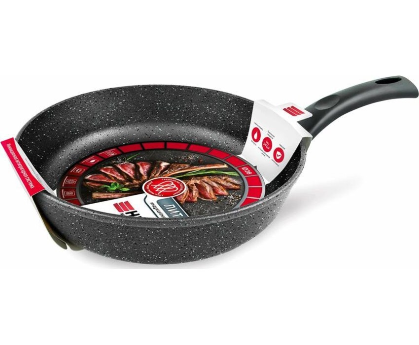 Тип сковорода универсальная Материал алюминий Антипригарное покрытие есть Совместимость с индукционными плитами есть Особенности мытье в посудомоечной машине, ненагревающаяся ручка Размеры Диаметр верха 28 см Диаметр дна 20.8 см Толщина дна 6.8 мм Высота стенок 7.08 см Толщина стенок 2.8 мм Вес 1.45 кг Литой алюминиевый корпус сковороды не подвержен деформации и обеспечивает равномерный нагрев. Многослойное антипригарное покрытие c эффектом натурального камня позволяет готовить с минимальным количеством масла и сохранять натуральный вкус продуктов. Антипригарное покрытие на водно-кремниевой основе безопасно, не содержит PFOA (перфтороктановой кислоты). Эта сковорода выполнена с использованием современной технологии «Full Induction», дно сковороды оснащено цельным ферромагнитным диском, который распознается всеми типами индукционных плит и обеспечивает быстрый разогрев сковороды до идеальной температуры для жарки.