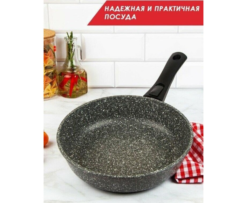 Сковорода 24 см Мрамор. Материал: пищевой литой алюминий. Антипригарное мраморное покрытие. Подходит для всех тип плит, в том числе индукционных. Имеет съемную ручку, легко чистится. Можно мыть в посудомоечной машине. Без крышки.