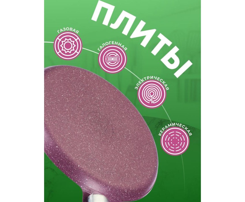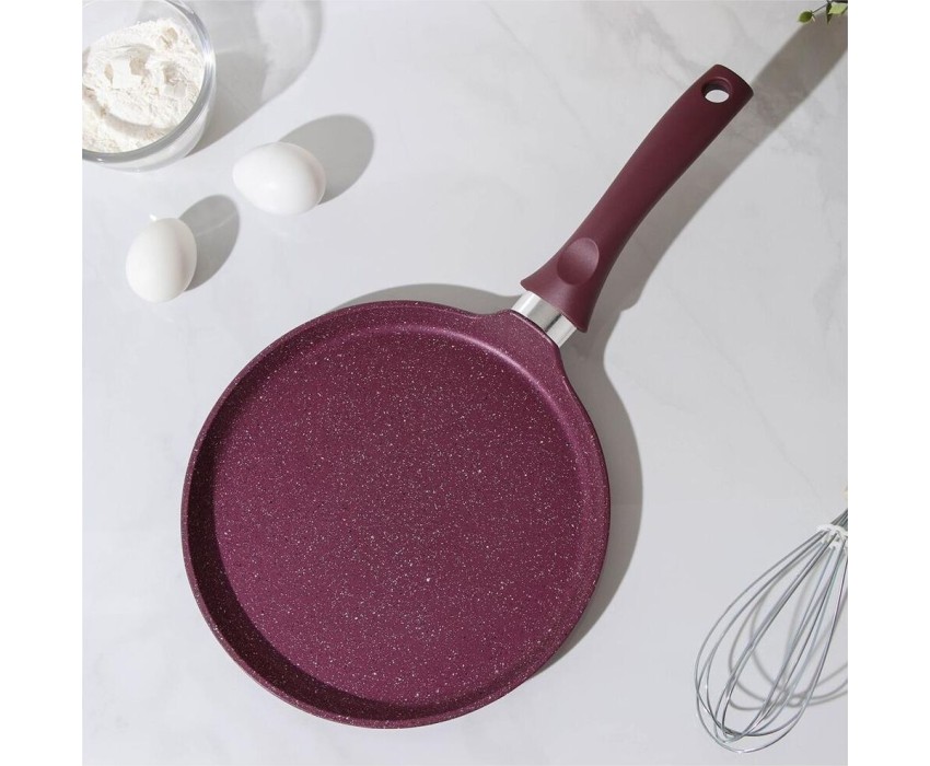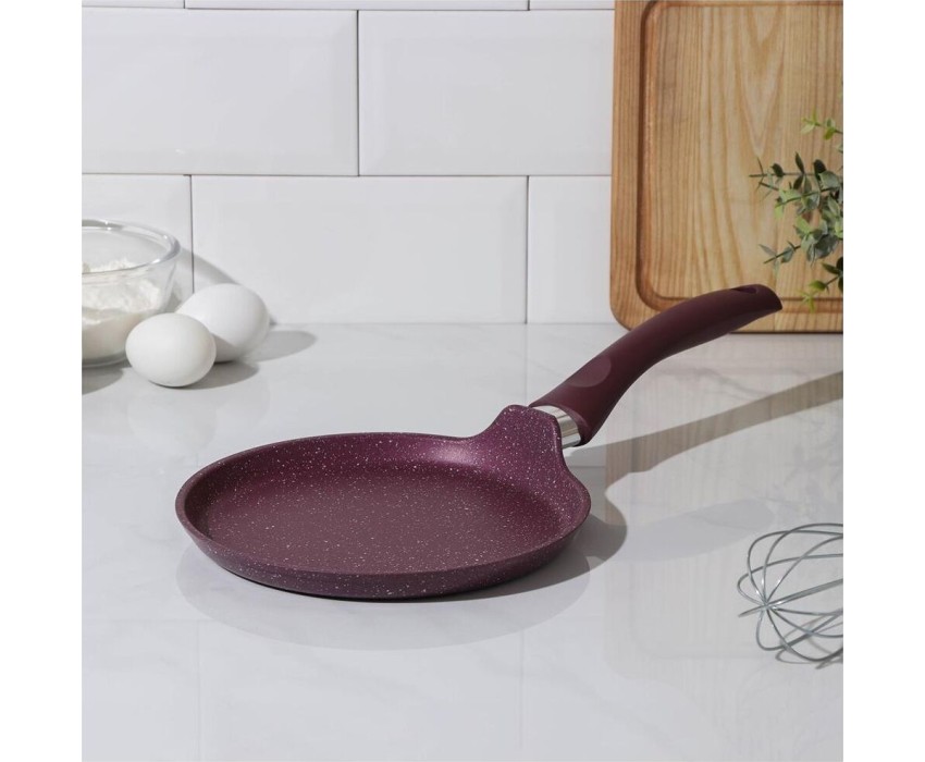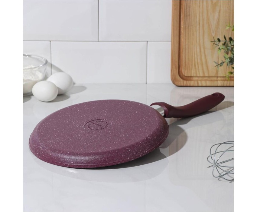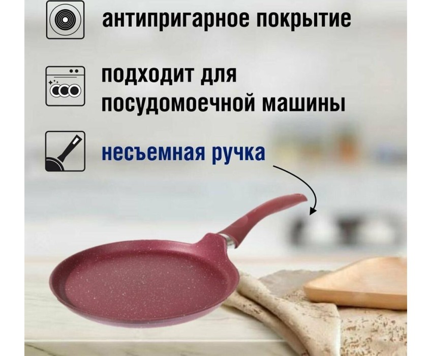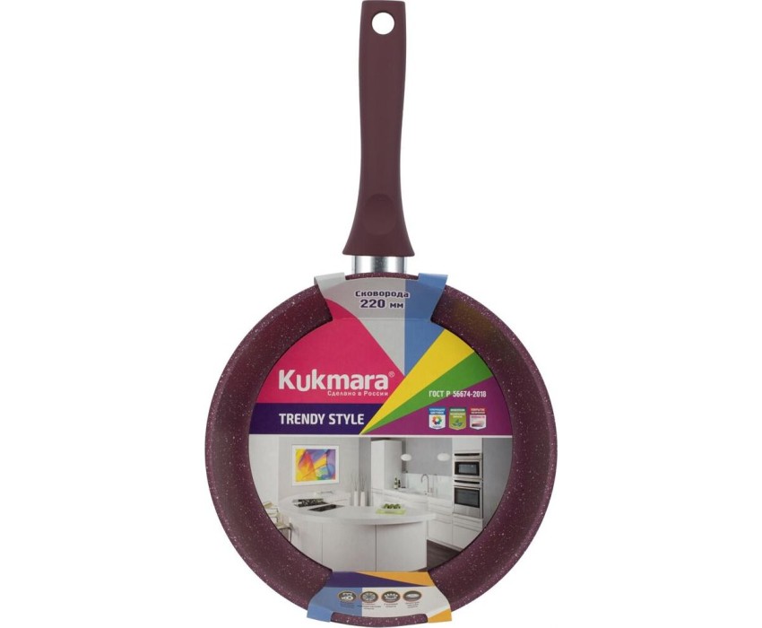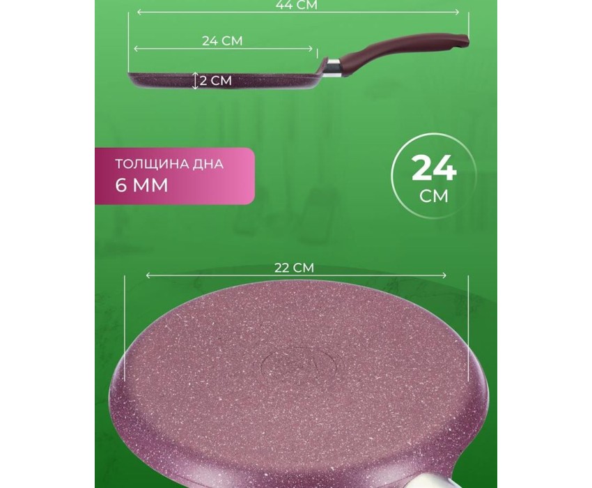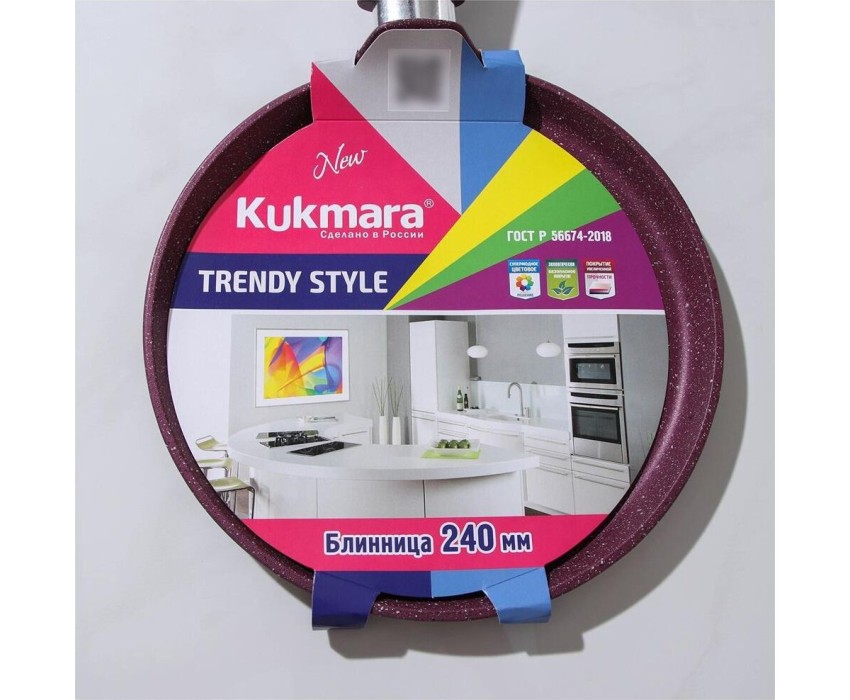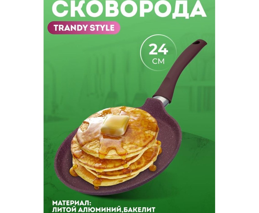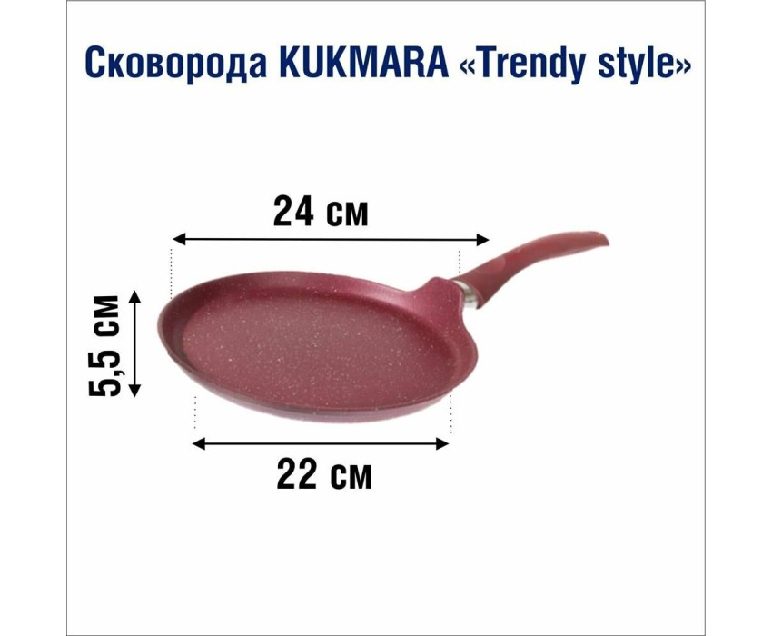 Сковорода антипригарная блинная 24 см Trendy style mystery ТМ KUKMARA. Изготовлена из литого алюминия. Подходит для всех типов плит, кроме индукционных. Можно мыть в посудомоечной машине. Произведено в России.