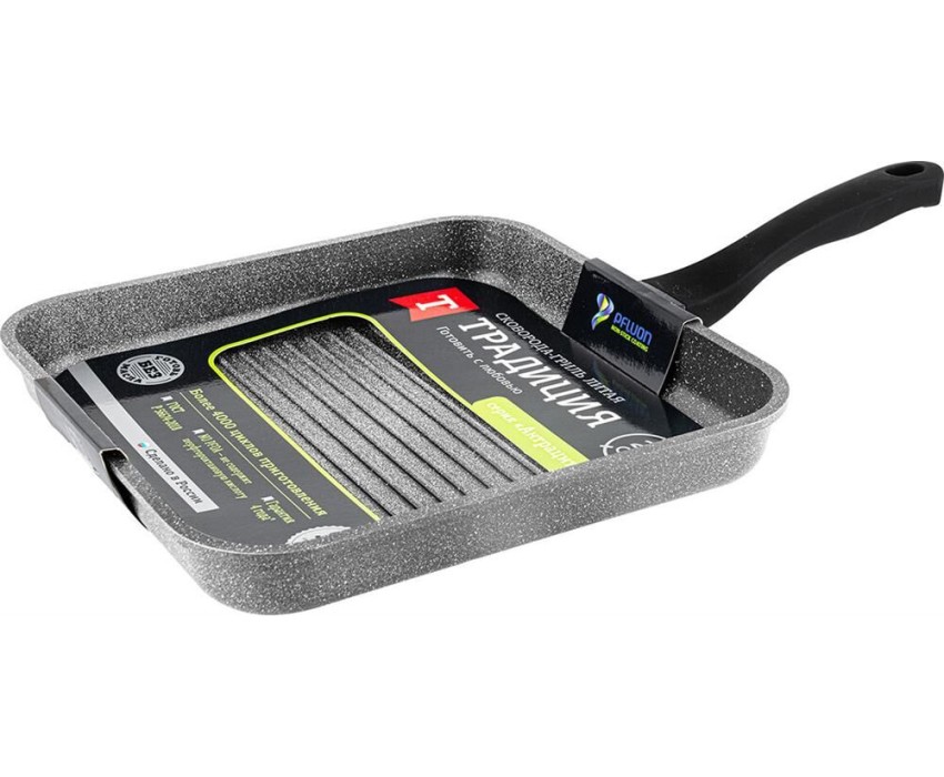 Сковорода-гриль литая с антипригарным покрытием ТМ & 34;Традиция готовить с любовью& 34;. Посуда предназначена для ежедневного использования в домашних условиях. Исключительная прочность и долговечность антипригарного покрытия, равносильная по стойкости природному камню, разработана специально для интенсивного использования на каждый день. Толстостенный литой корпус. Пятислойная антипригарная система покрытия последнего поколения. Премиальное покрытие усиленное минеральными частицами.