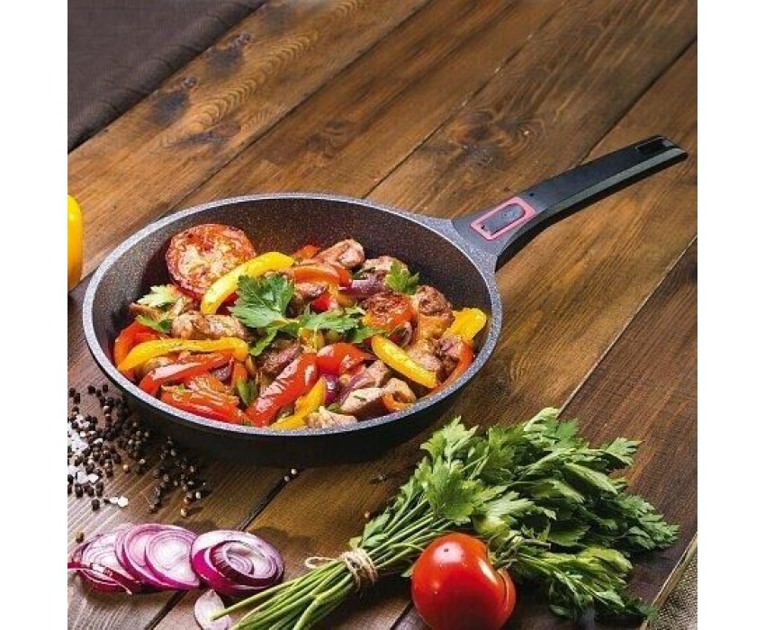Литой алюминий. Покрытие: Двухслойное антипригарное Whitford Xylan Plus, не содержит PFOA, выдерживает до 7 тысяч циклов на истирание. Размер: Диаметр 24 см, внешний диаметр дна – 16,8 см, Высота борта 5,5 см Толщина дна 4,8 мм, Толщина стенки 2 мм Макси