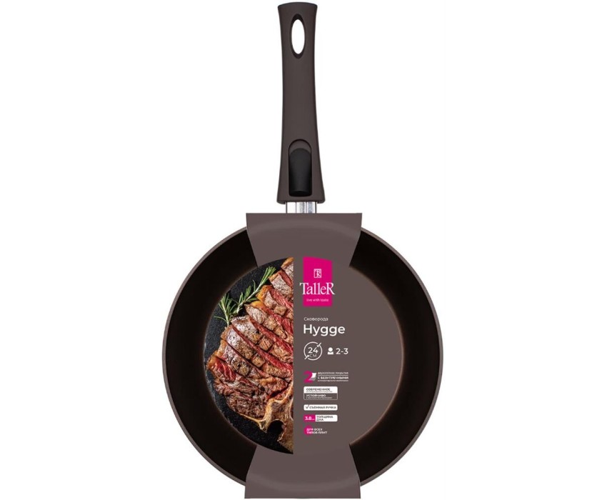 Сковорода Hygge, 24 см, с бакелитовой съемной ручкой. Материал: кованый алюминий, толщина дна 3,8 мм, толщина стенок 3,3 мм Высота 4,8 см внешний диаметр дна – 19.4 см Подходит для всех типов плит, включая индукционную. Рекомендовано ручное мытьё. Упаков