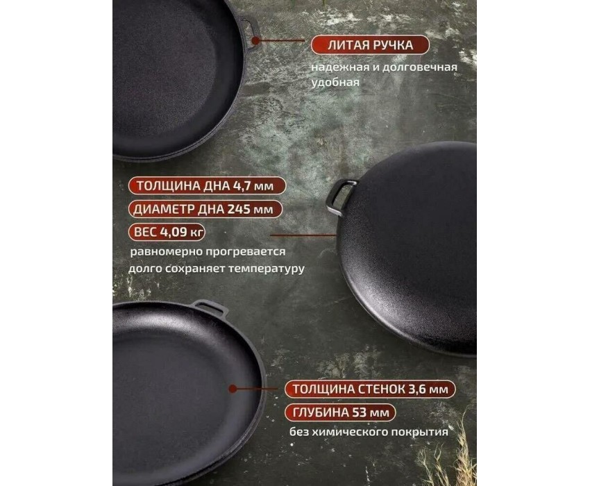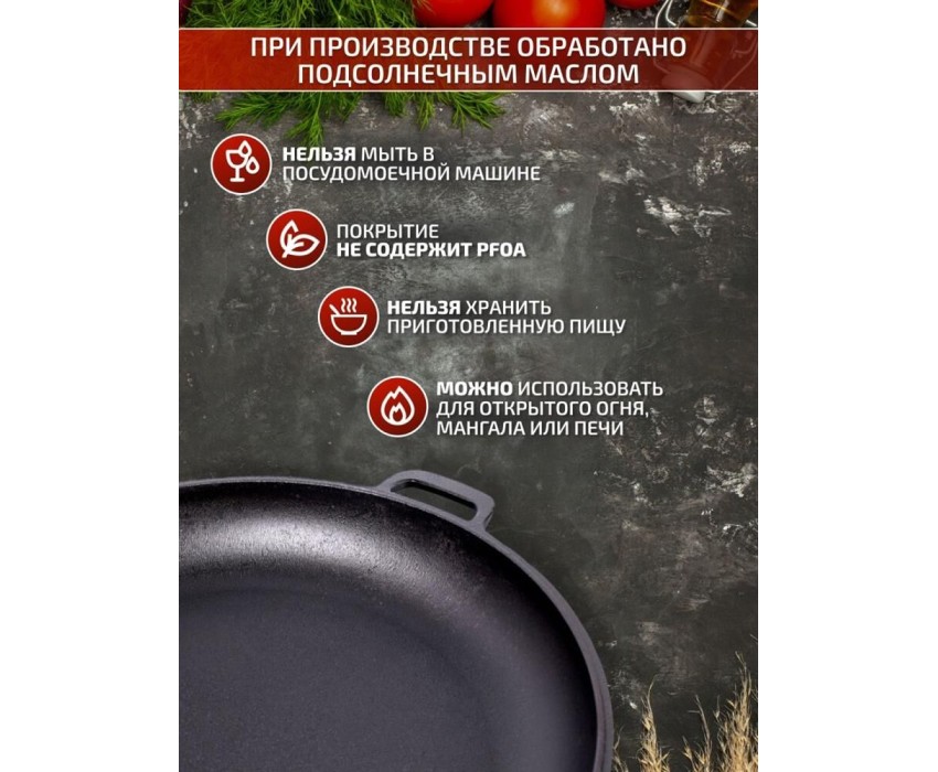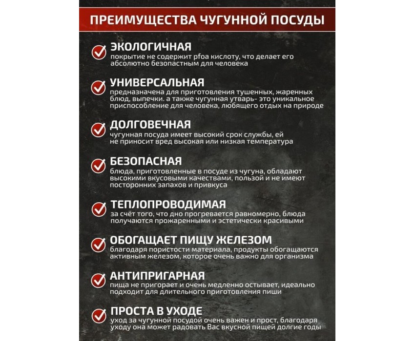 Литая чугунная посуда изготовлена по традиционной технологии литья чугуна в кокиль. Общепризнанно посуда из чугуна является лучшей для приготовления пищи. Она аккумулирует и выделяет тепло на протяжении длительного периода времени. Экологически чистая, естественная среда позволяет приготовить максимально насыщенные и вкусные блюда. Повышенная долговечность и износостойкость Высокая теплопроводность и эргономичность Удобство в использовании Идеальное распределение тепла по всей поверхности посуды, длительное