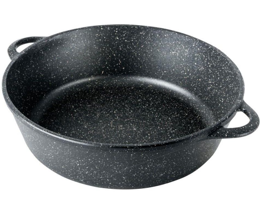 Литая алюминиевая жаровня с антипригарным покрытием подходит для газовых, электрических и стеклокерамических плит. Это разновидность сковороды с двумя ручками и широким дном. Жаровня имеет важное преимущество; в ней можно готовить не только на плите, но в