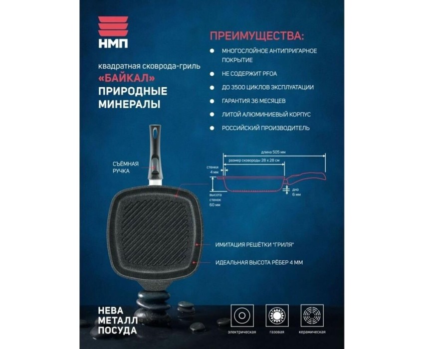 Высококачественная сковорода гриль 28 см квадратной формы со съемной ручкой, произведенная в России. Нева Металл Посуда. Природные минералы. Коллекция Байкал 254028G. Богатство природных минералов и уникальная технология производства объединились при разработке линии посуды «байкал». Вдохновляясь безупречным минимализмом забайкальских зимних пейзажей мы создали уникальный по своим свойствам продукт, сочетающий в себе безопасность и долговечность использования.