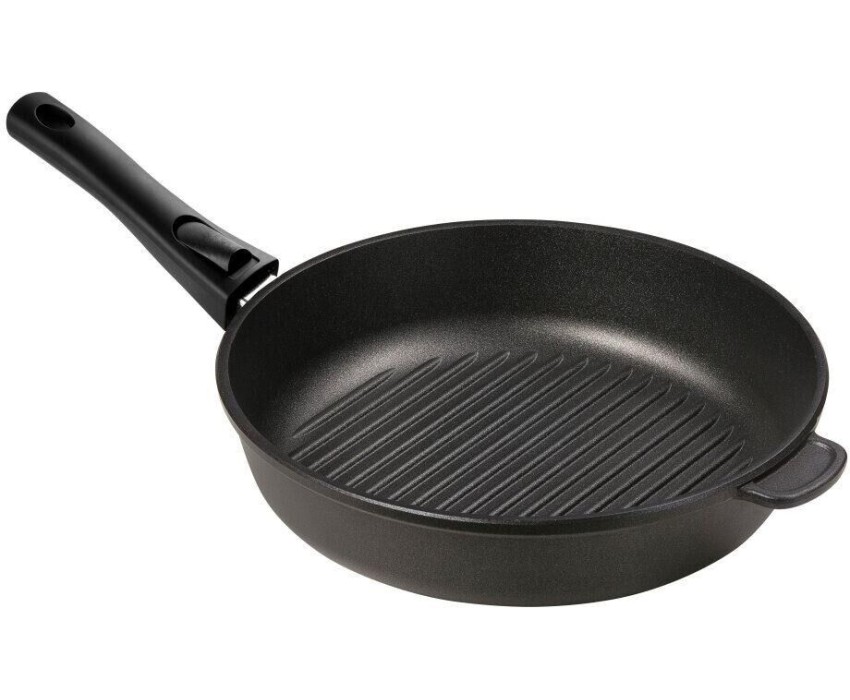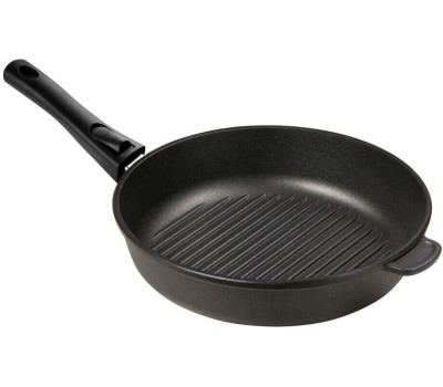 Литая алюминиевая сковорода-гриль с антипригарным покрытием производства подходит для газовых, электрических и стеклокерамических плит. Используется для жарки мяса, овощей, рыбы, морепродуктов практически без добавления масла. Сковорода-гриль серии «Класс
