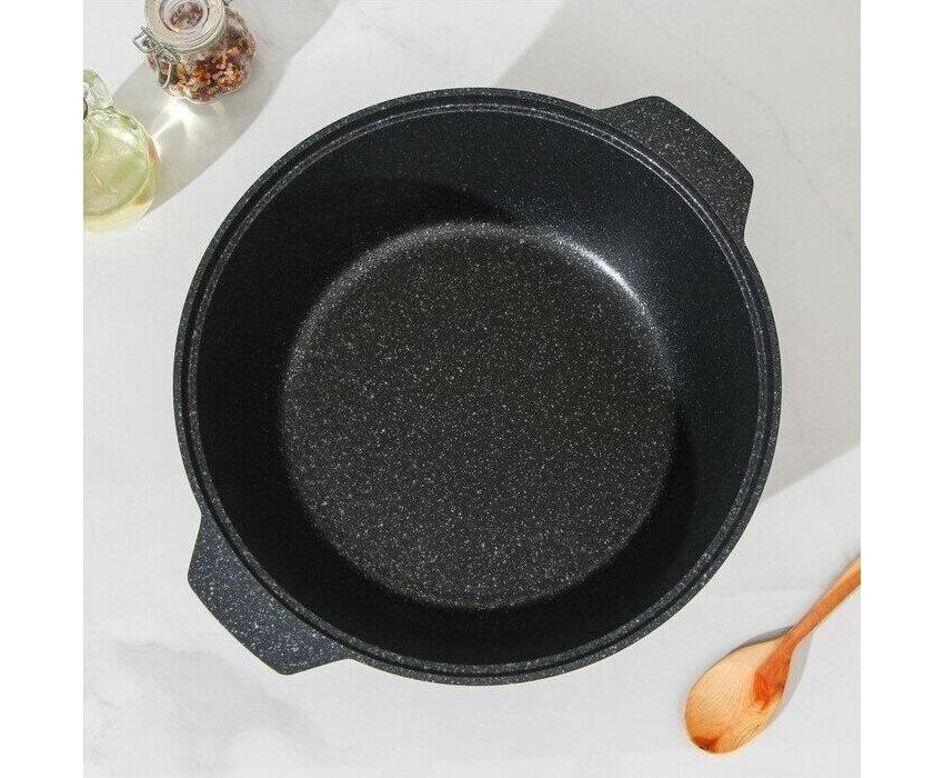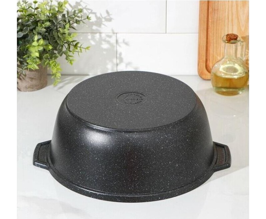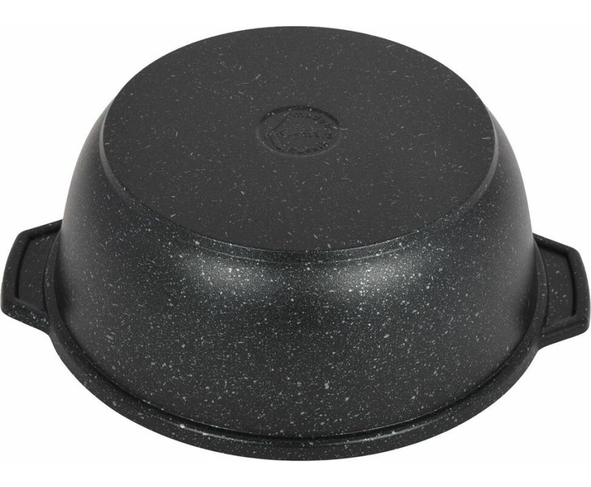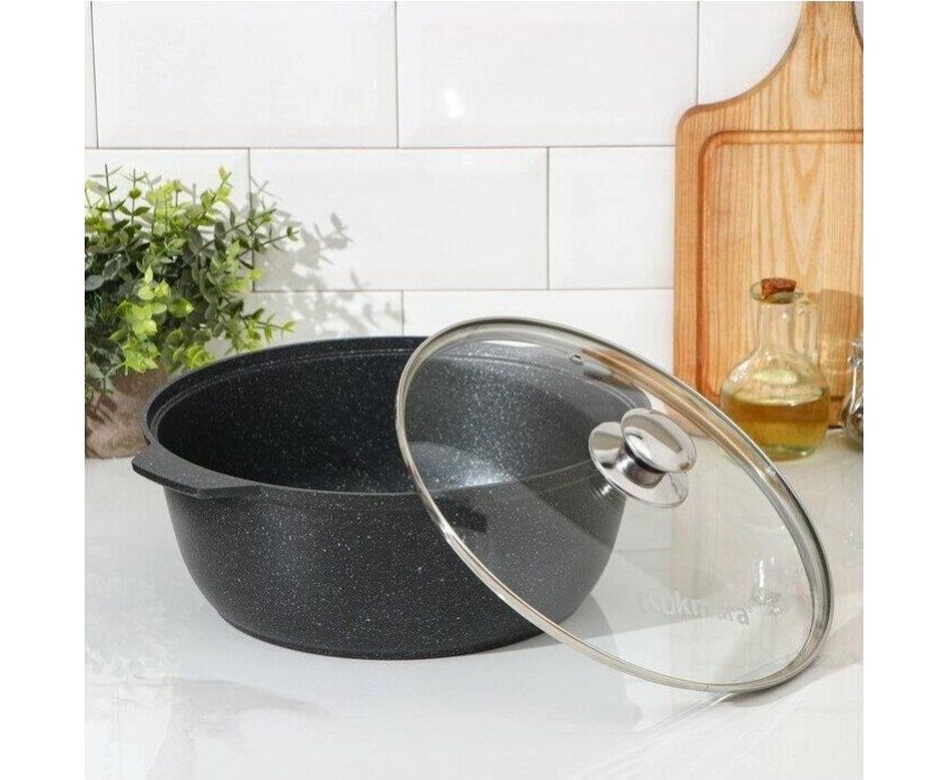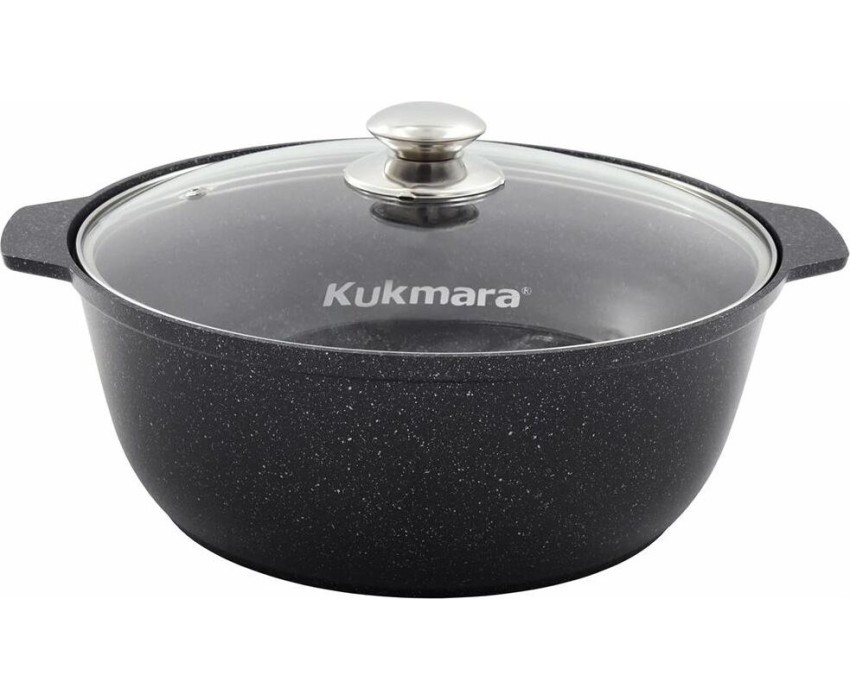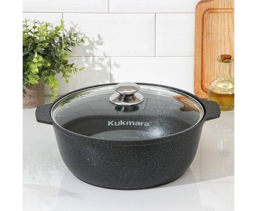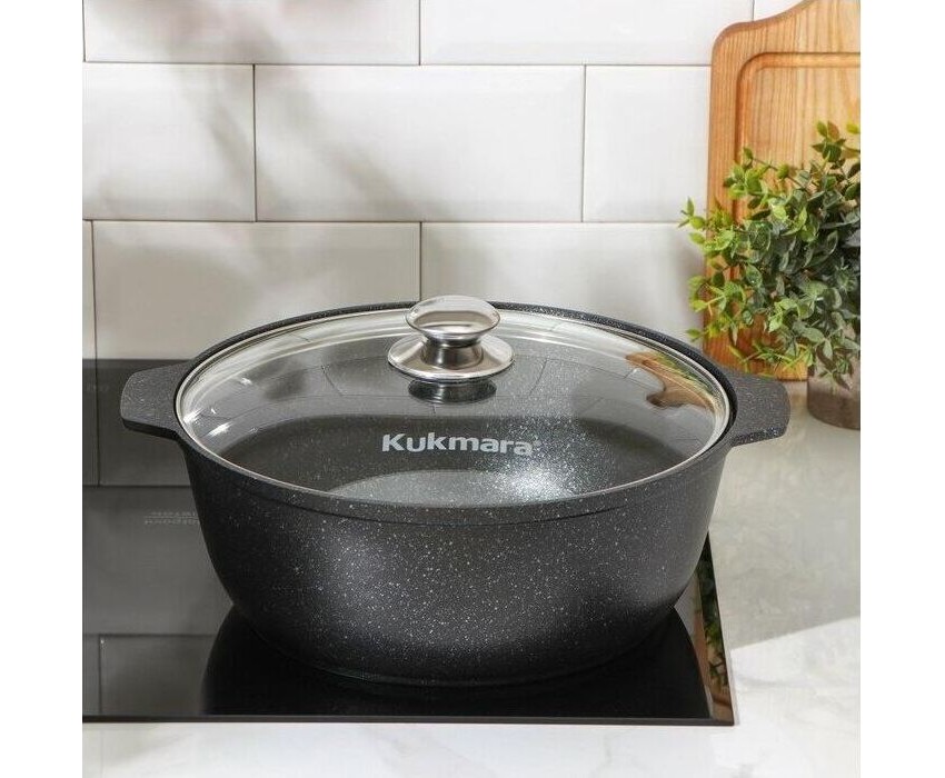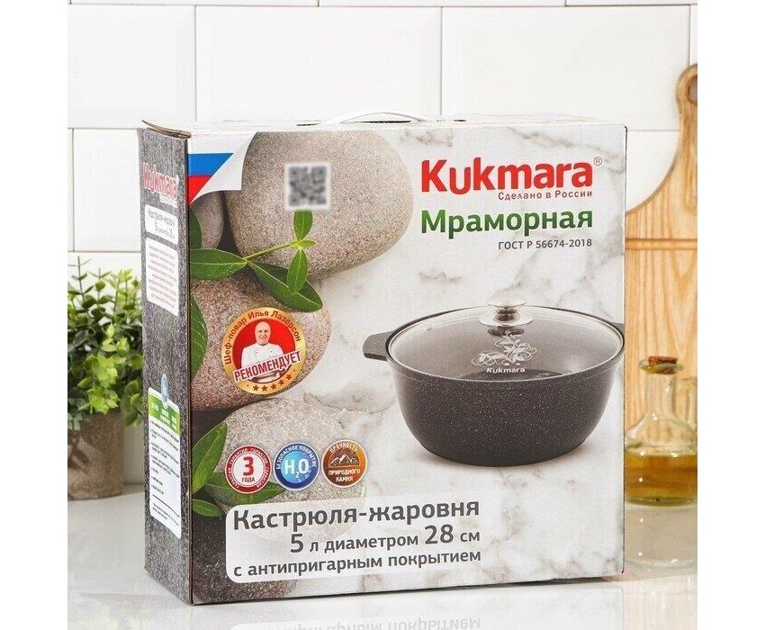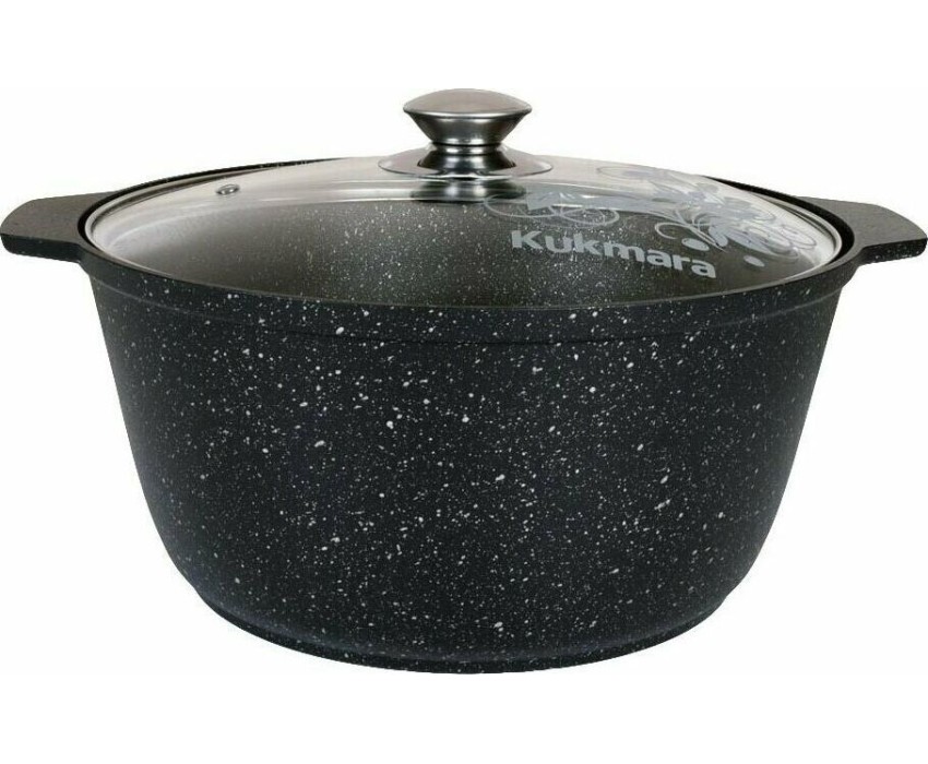 Кастрюля-жаровня "Kukmara" 5 л изготовлена из литого алюминия и покрыта антипригарным покрытием. Значительная толщина стенок и дна исключает деформацию корпуса изделий. Подходит для всех типов плит и индукционных. Можно мыть в посудомоечной машине.
