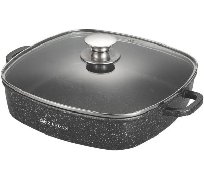 Жаровня со стеклянной крышкой – 4,5 л (28х28x7см), литой алюминий, крышка - стекло с силиконовым ободком и металлической ручкой, ИНДУКЦИОННОЕ ДНО, СИЛИКОНОВЫЕ НАКЛАДКИ, ВНУТРЕННЕЕ АНТИПРИГАРНОЕ ПОКРЫТИЕ «Queen Home», ВНЕШНЕЕ ЖАРОПРОЧНОЕ АНТИПРИГАРНОЕ ПОКРЫТИЕ.