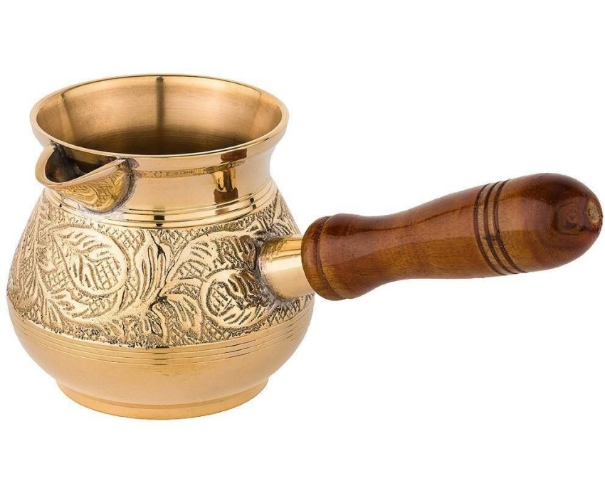 самыми популярными турками являются латунные. Индия издавна славится своими искусными мастерами по обработке металлов, в частности латуни. Основные преимущества: • Эксклюзивность (каждое изделие по своему уникально благодаря ручной работе – минимум машинной обработки, роспись и чеканка делается вручную) • Съемная деревянная ручка (удобно мыть и хранить) • Можно использовать на газовой, электрической и стеклокерамической плите • Экологически чистый материал (в процессе приготовления в пищу не выделяются вредные вещества) • Неприхотливы в уходе (легко чистится подручными средства, только следует избегать абразивных и кислотосодержащих моющих средств)• Долговечны, т.к. латунь не подвержена коррозии Рекомендации по уходу:• Турки для кофе, которые новые, перед использованием нужно ополоснуть кипятком, а первый приготовленный в ней кофе лучше слить.