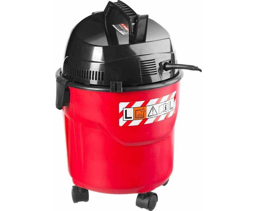 Тип - хозяйственный для влажной и сухой уборки. Мощность - 1200 Вт. Рабочее разрежение (не менее) - 16 кПа. Объем бака - 15л. Розетка для электроинструмента - нет. Класс пыли - L. Фильтр- HEPA. Функция выдувания - нет. Влажная уборка- есть. Длина всасывающего шланга - 2м. Диаметр всасывающего шланга - 30мм. Диаметры патрубка-переходника - 22-41мм. Длина кабеля - 4м. Напряжение питания, В/Гц 220±10% /50. Габариты - 33x33x48 см. Масса изделия - 5.0 кг. Масса в упаковке - 6.3 кг.