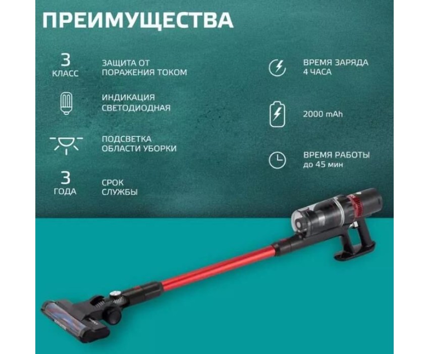 Тип пылесоса вертикальный беспроводной Мощность 380 Вт Мощность всасывания 100 Вт Регулировка мощности 3 уровня Бесколлекторный двигатель да Время непрерывной работы до 45 мин. Уровень шума 75 дБ Объем пылесборника 0,8 л. Подсветка области уборки да Индикация выбранного режима работы да Индикация уровня заряда батареи да Крепление на стену да Турбощетка с электроприводом да Щелевая насадка да Насадка для мебели да Питание Тип аккумулятора Li-Ion Съемный аккумулятор да Напряжение аккумулятора 25.9 В Емкость аккумулятора 2000 мАч Время полной зарядки до 4 часов Входное напряжение сетевого адаптера 110-240 В, 50-60 Гц Выходное напряжение сетевого адаптера 30 В, 500 мА Защита от поражения электрическим током класс 3 Корпус Цвет красный/серебро Вес 2.3 кг. Вес с упаковкой 3.5 кг. Размеры (ШхВхГ) 250x1080x218 мм. Размеры упаковки (ШхВхГ) 630х255х130 мм.
