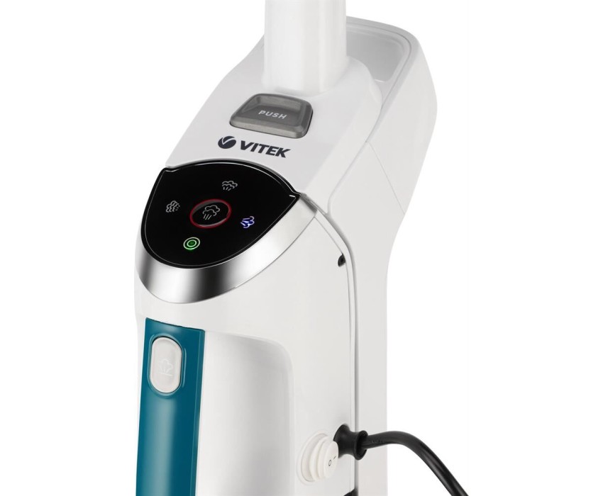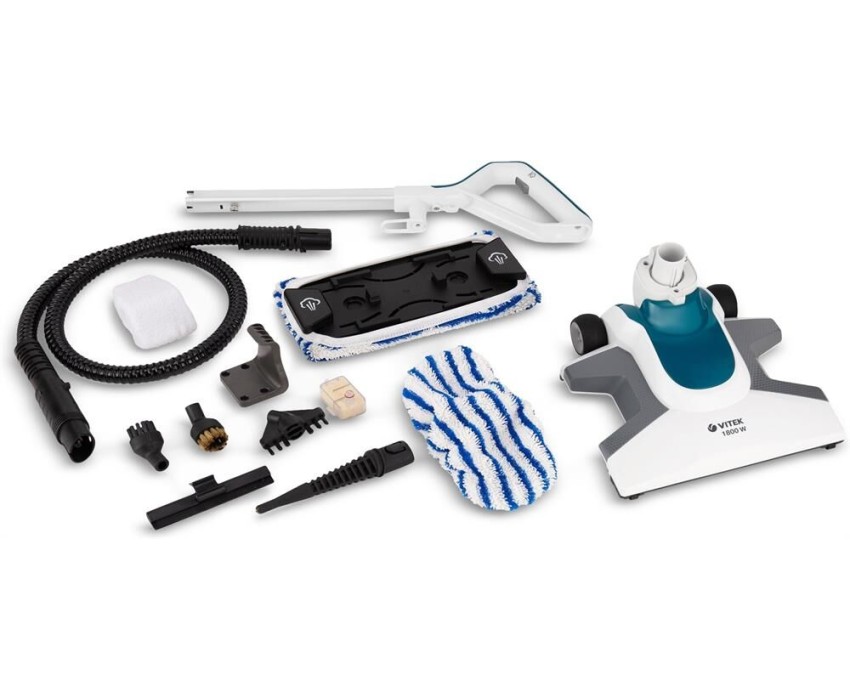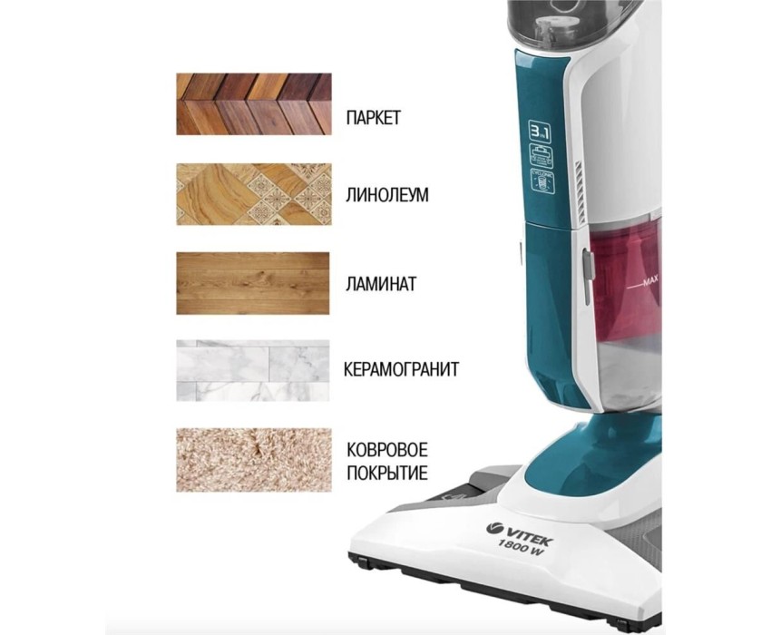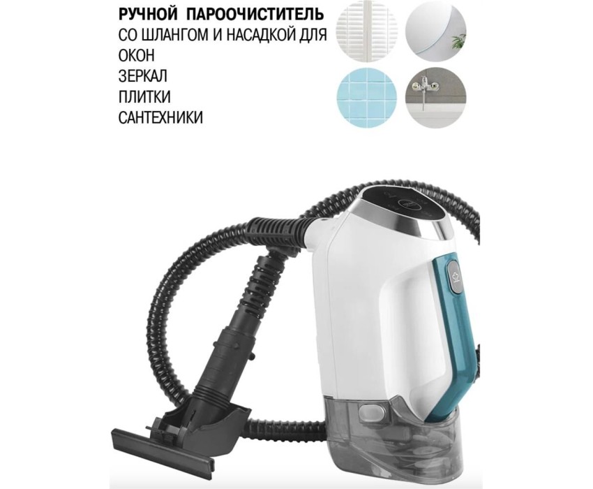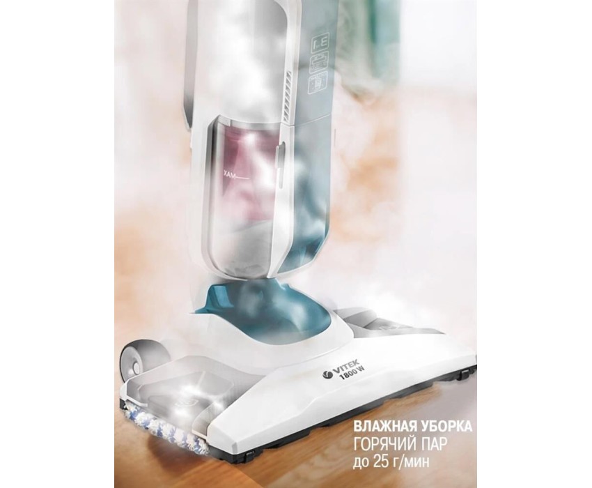 Вертикальный паровой пылесос.Тип уборки: сухая/влажная, Мощность всасывания: 12 кПа Вт, Объём пылесборника: 0,4 литра, Тип пылесборника: контейнер, Длина сетевого шнура: 5 метров, Настенное крепление, Источник питания, Дополнительно: 3-в-1 вертикальный пылесос, паровая швабра, ручной пароочиститель, Количество режимов движения: 3, Подача пара: 15-25 г/мин, Объем резервуара для воды: 0,5 литра, Фильтр для воды (анти-кальциевый), Мощность паровой швабры: 1200 Вт, Номинальная потребляемая мощность: 1800 вт, Цвет: Белый/аквамарин