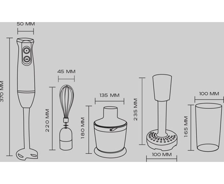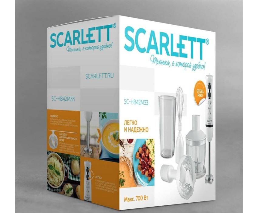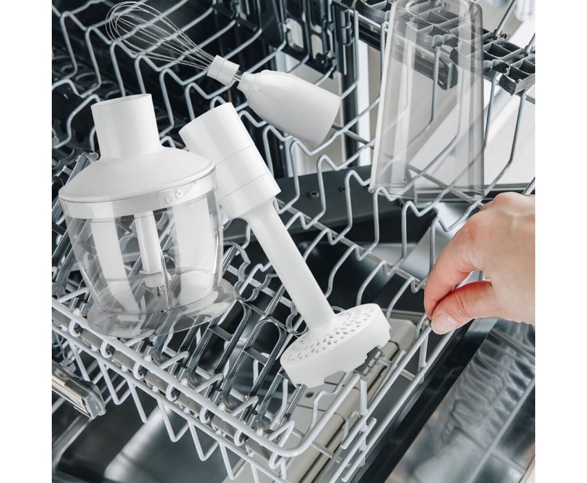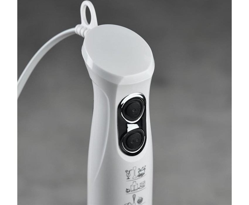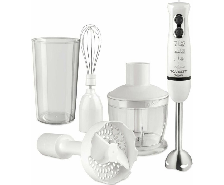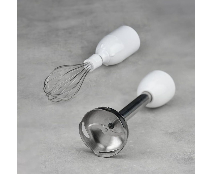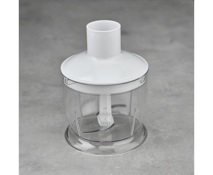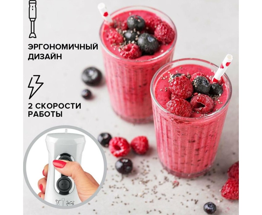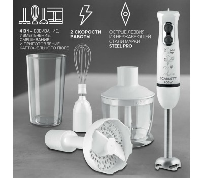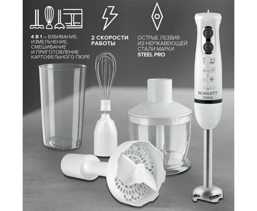 Максимальная мощность 700 Вт, 4 в 1: подходит для измельчения, взбивания, смешивания, приготовления картофельного пюре, Измельчитель 0.6л Насадка блендер из нержавеющей стали Steel Pro, Венчик для взбивания Насадка для картофельного пюре - специальная насадка с двумя широкими лопастями приготовит идеальное воздушное пюре без комочков, Мерный стакан 0.6л