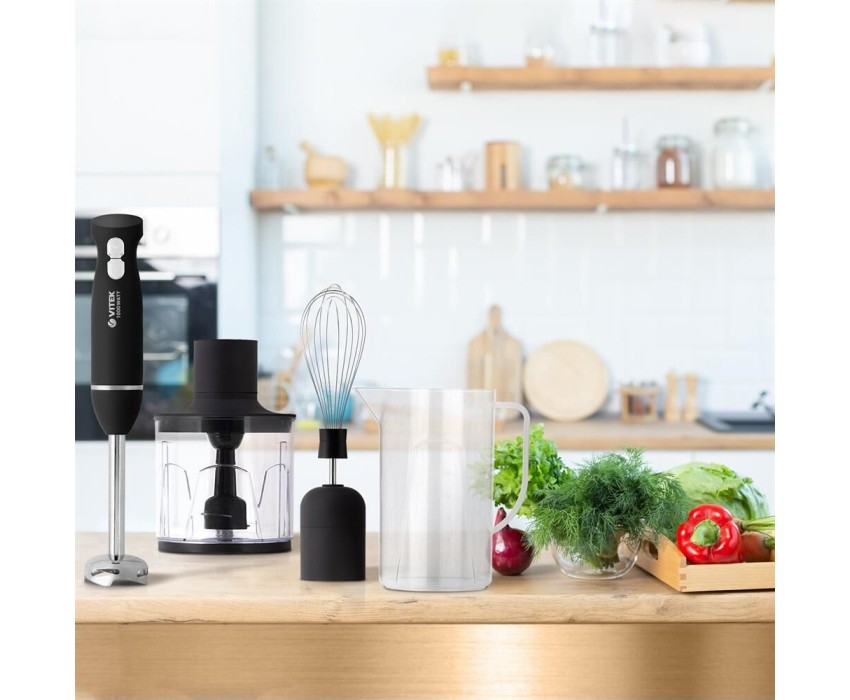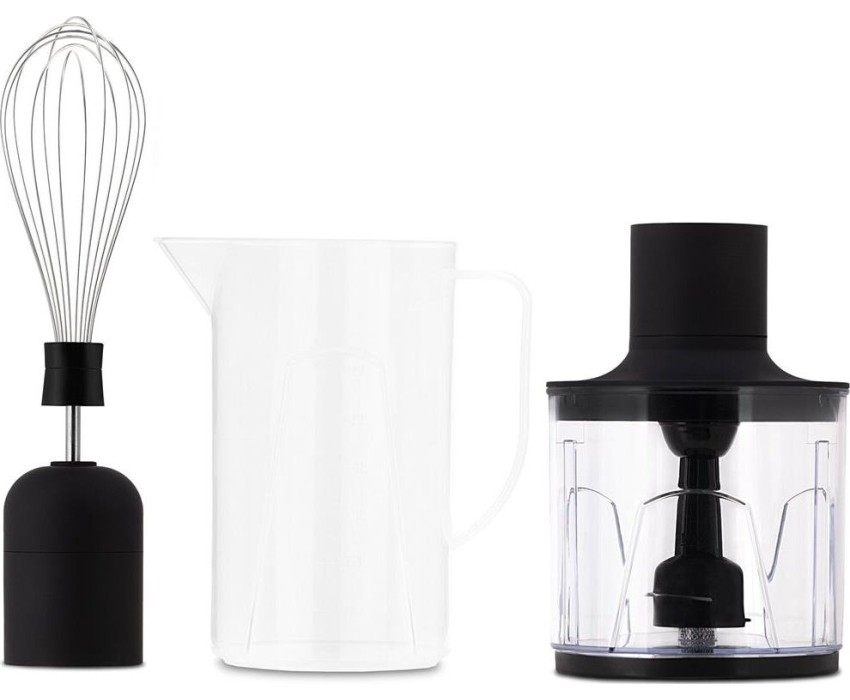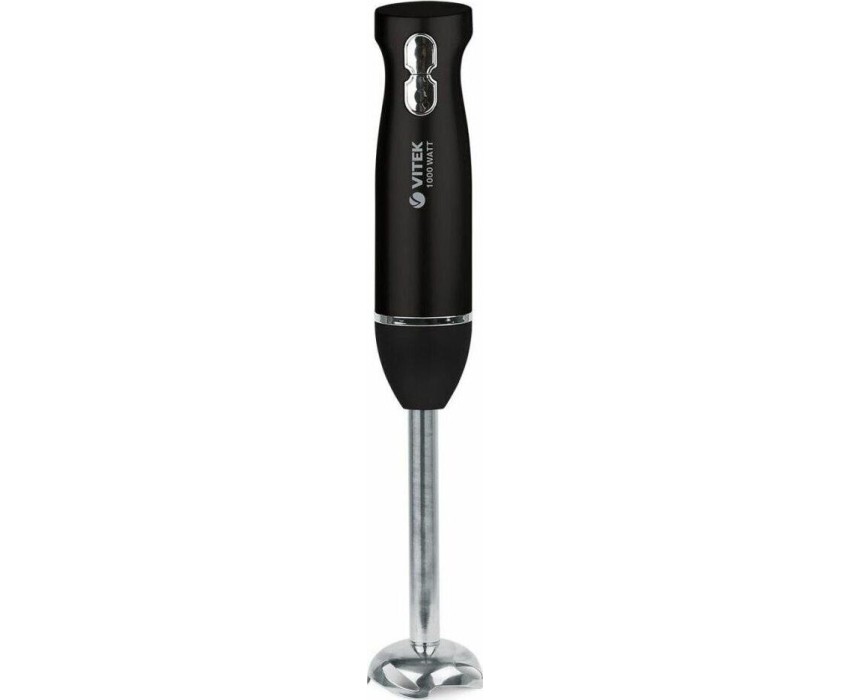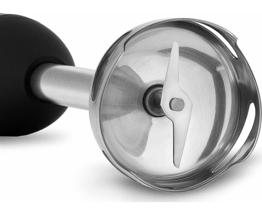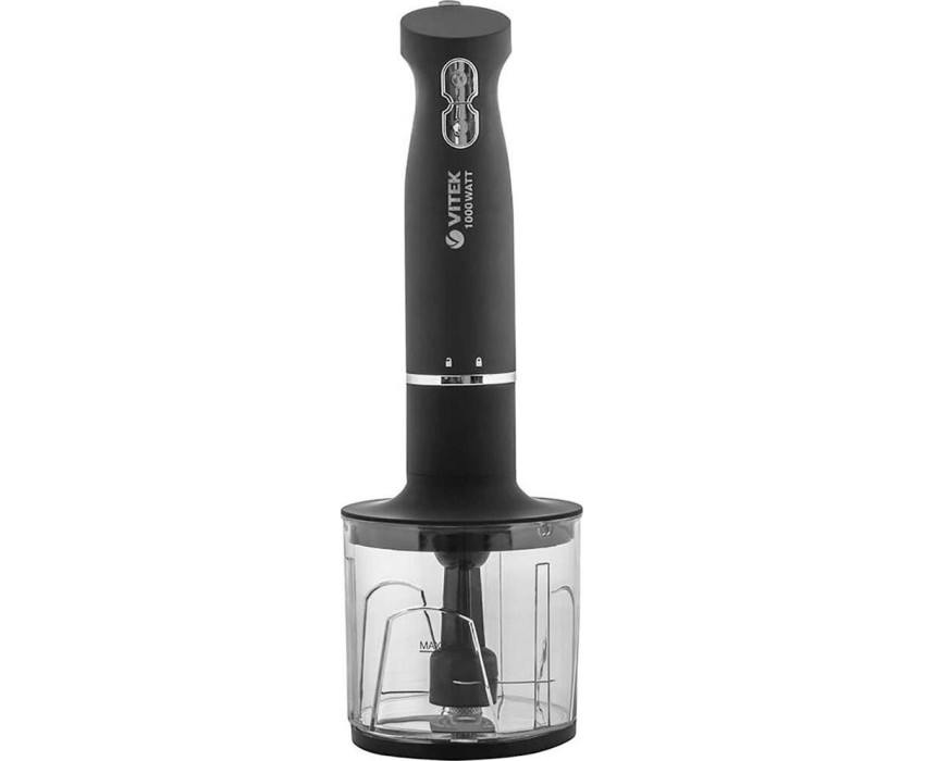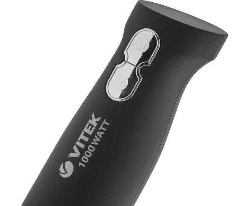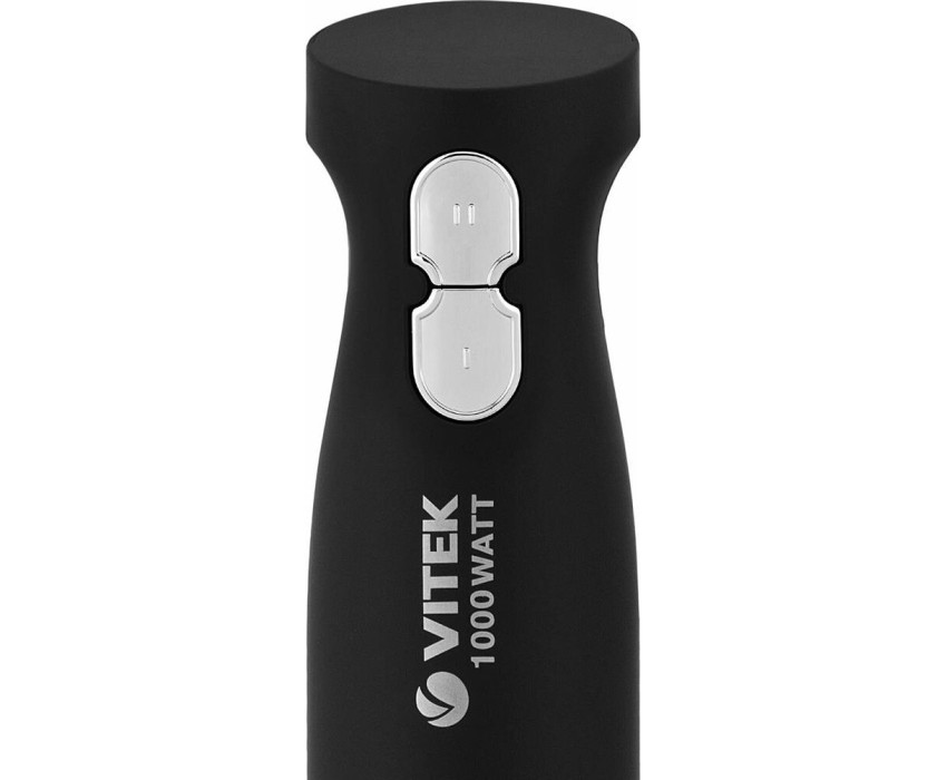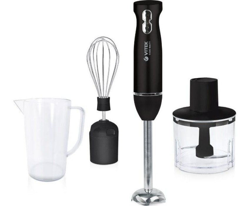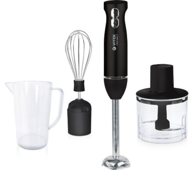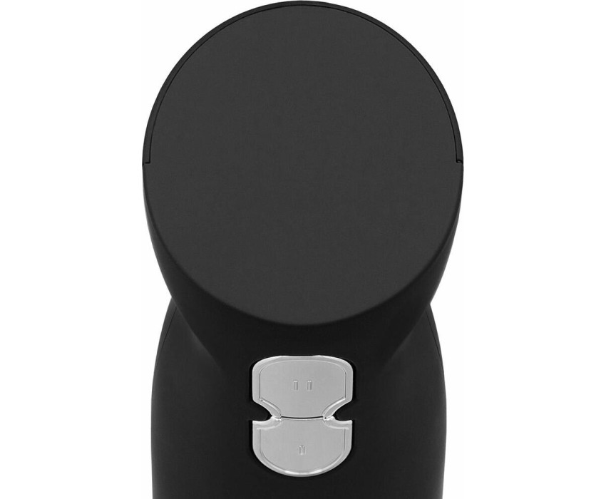 Блендер погружной. Мощность: 1000 вт, Количество скоростей: 2, Управление: механическое, Материал корпуса: пластик, Материал погружной части: нержавеющая сталь, Емкость измельчителя: 500 мл, Емкость мерного стакана: 800 мл, Венчик для взбивания, Длина сетевого шнура: 110см, Цвет: Черный