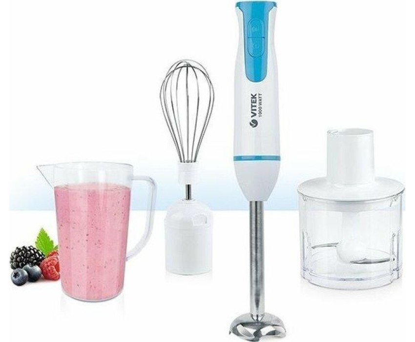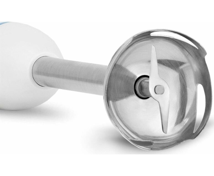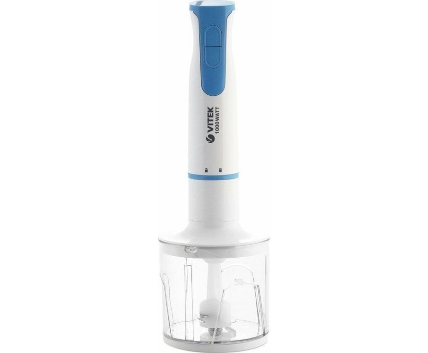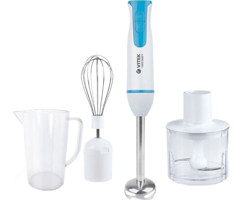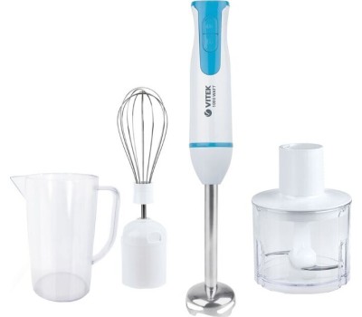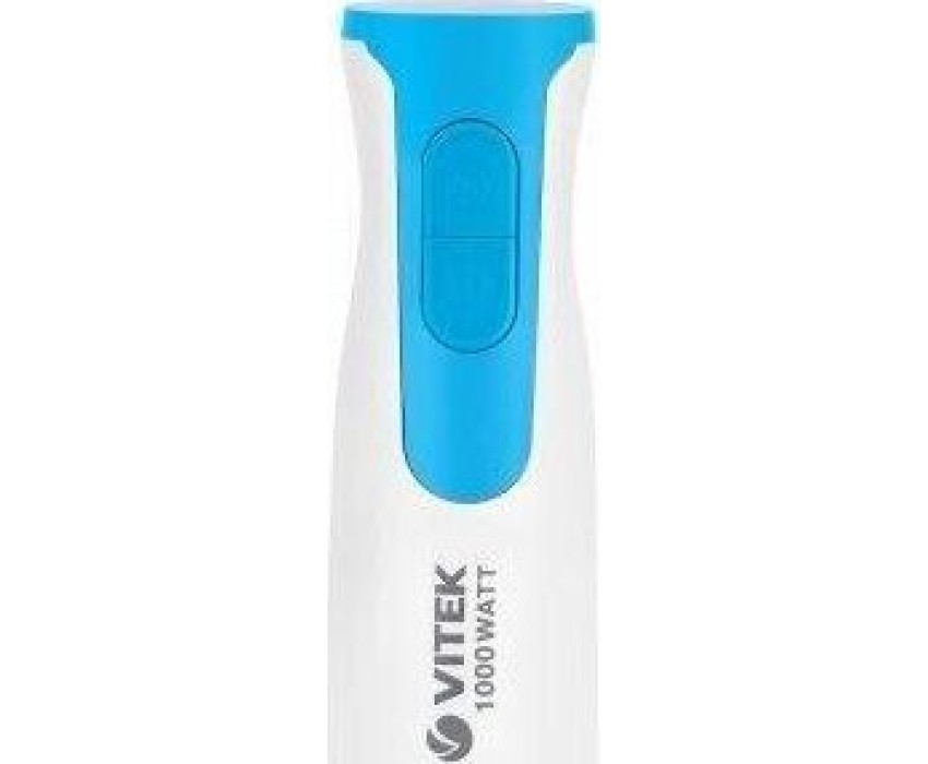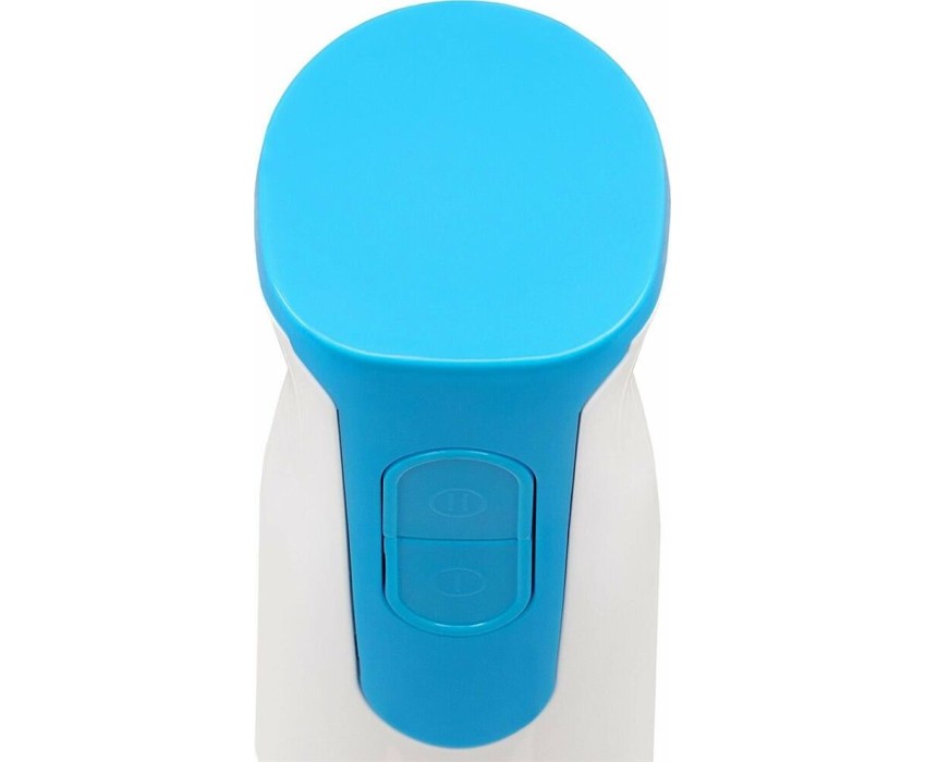 Блендер погружной. Мощность: 1000 вт, Количество скоростей: 2, Управление: механическое, Материал корпуса: пластик, Материал погружной части: нержавеющая сталь, Емкость измельчителя: 500 мл, Емкость мерного стакана: 800 мл, Венчик для взбивания, Длина сетевого шнура: 110см, Цвет: Белый/голубой