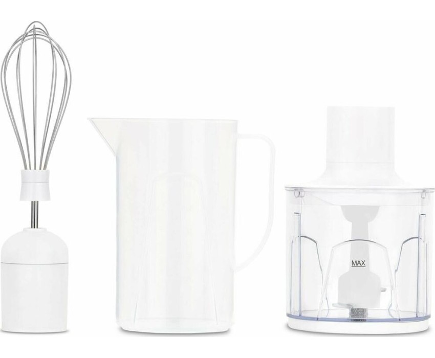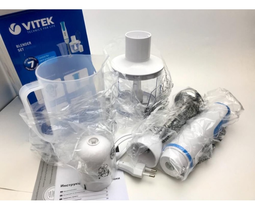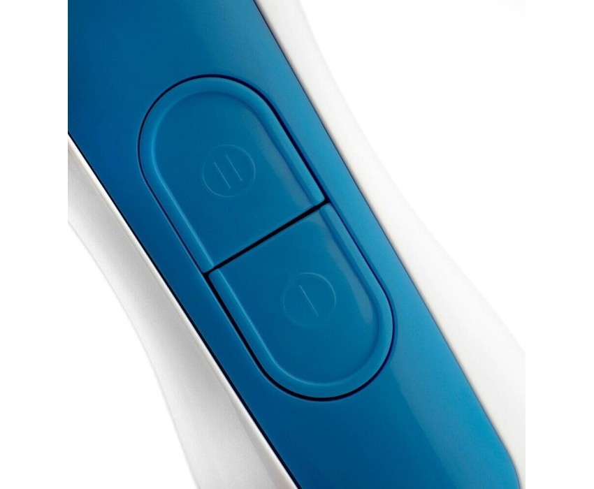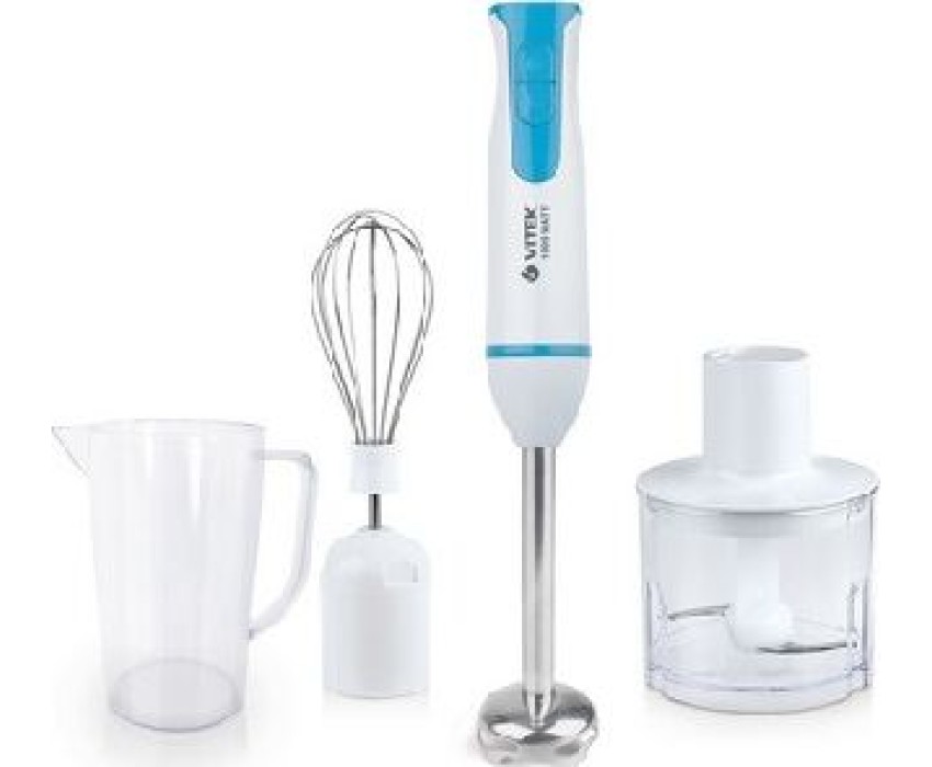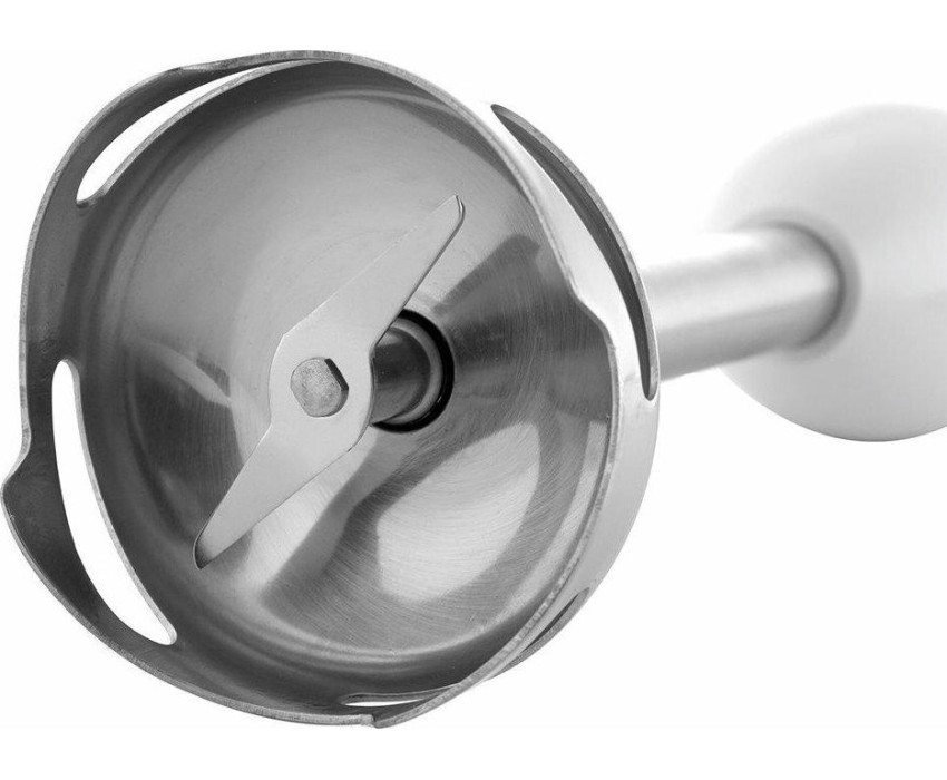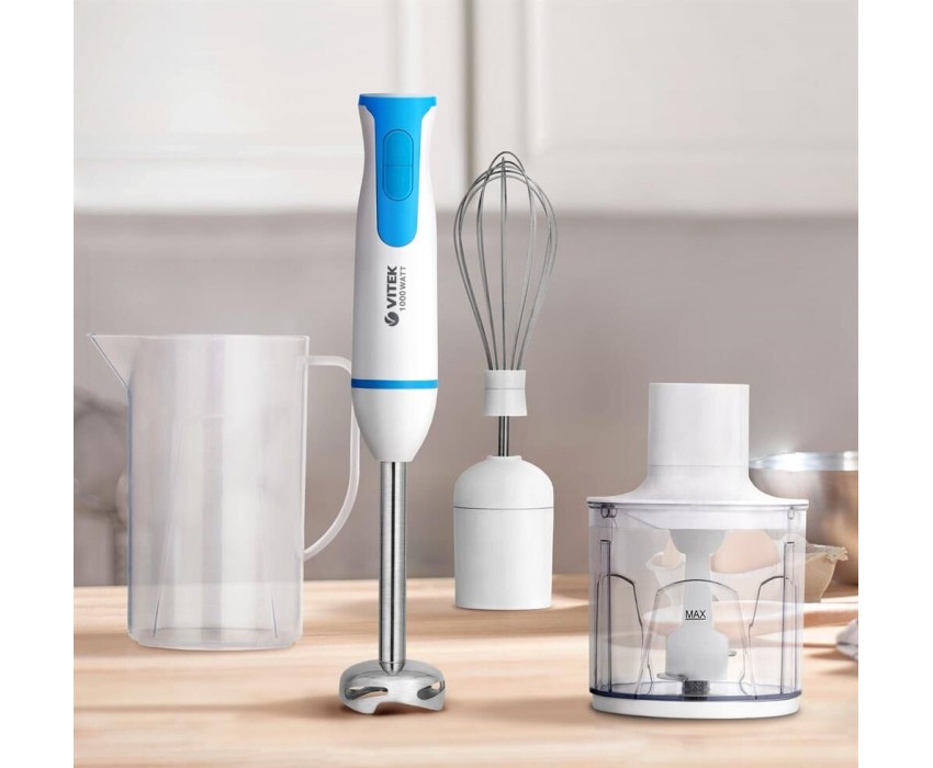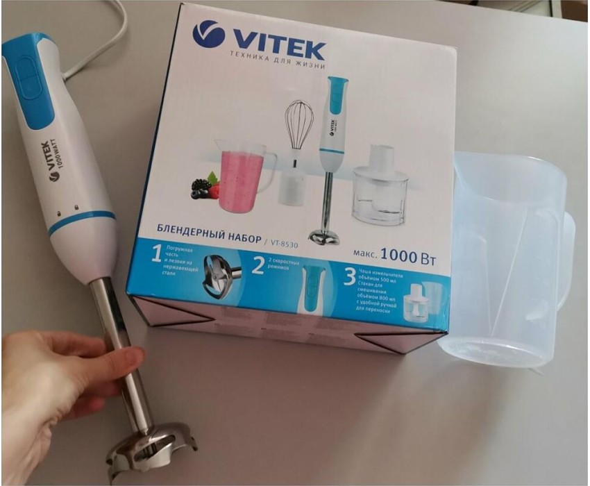Блендер погружной. Мощность: 1000 вт, Количество скоростей: 2, Управление: механическое, Материал корпуса: пластик, Материал погружной части: нержавеющая сталь, Емкость измельчителя: 500 мл, Емкость мерного стакана: 800 мл, Венчик для взбивания, Длина сетевого шнура: 110см, Цвет: Белый/голубой