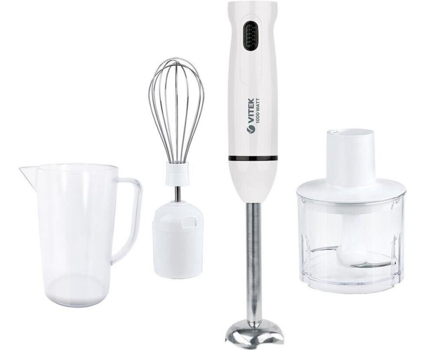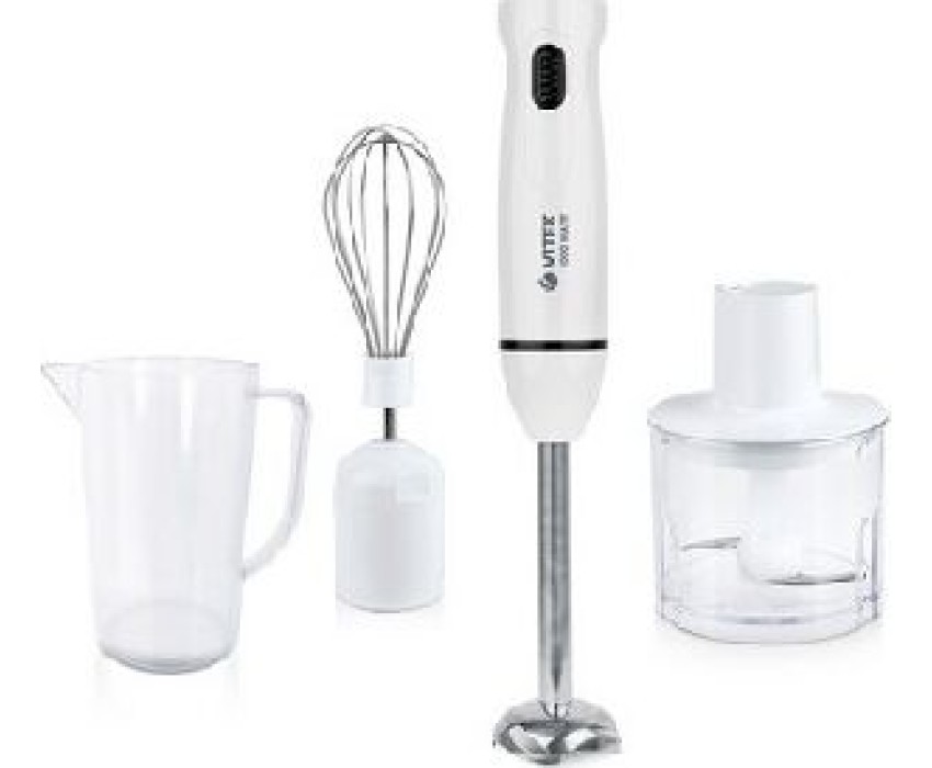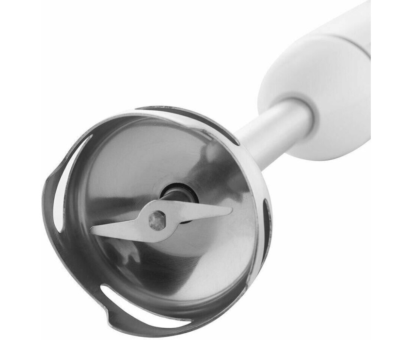 Блендер погружной. Мощность: 1000 вт, Количество скоростей: 1, Управление: механическое, Материал корпуса: пластик, Материал погружной части: нержавеющая сталь, Емкость измельчителя: 500 мл, Емкость мерного стакана: 800 мл, Венчик для взбивания, Длина сетевого шнура: 110см, Цвет: Белый