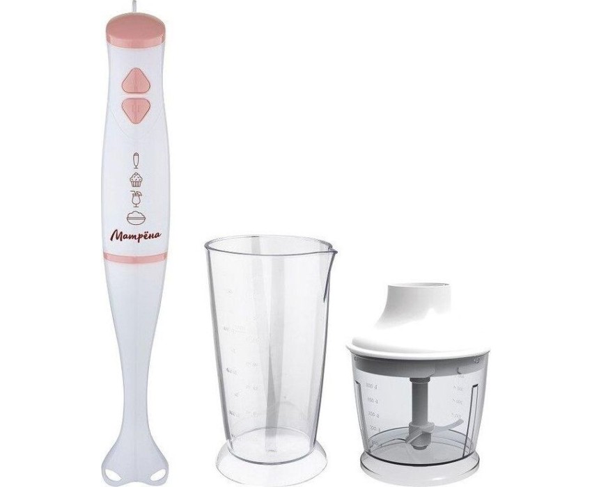 2 скорости работы. Ножи из нержавеющей стали. Пластиковая насадка блендер. Мощность 350Вт. Измельчитель 500 мл. Стакан для смешивания 800 мл.