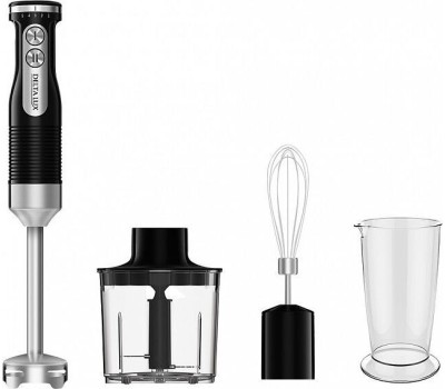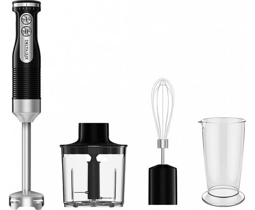 Максимальная мощность 1000Вт. Номинальная потребляемая мощность 600 Вт. Объем чаши измельчителя 500 мл. Объем мерного стакана 700 мл. Блендер электрический предназначен для смешивания, измельчения и взбивания продуктов и жидкостей в бытовых условиях. Цвет: черный. Насадки и ножи из нержавеющей стали. Специальная заточка ножей. Три сменные насадки: насадка для смешивания, венчик для взбивания, измельчитель. Противоскользящие ножки чаши измельчителя. Мерный стакан. 5 скоростных режимов. Режим «ТУРБО». Плавная регулировка скорости.