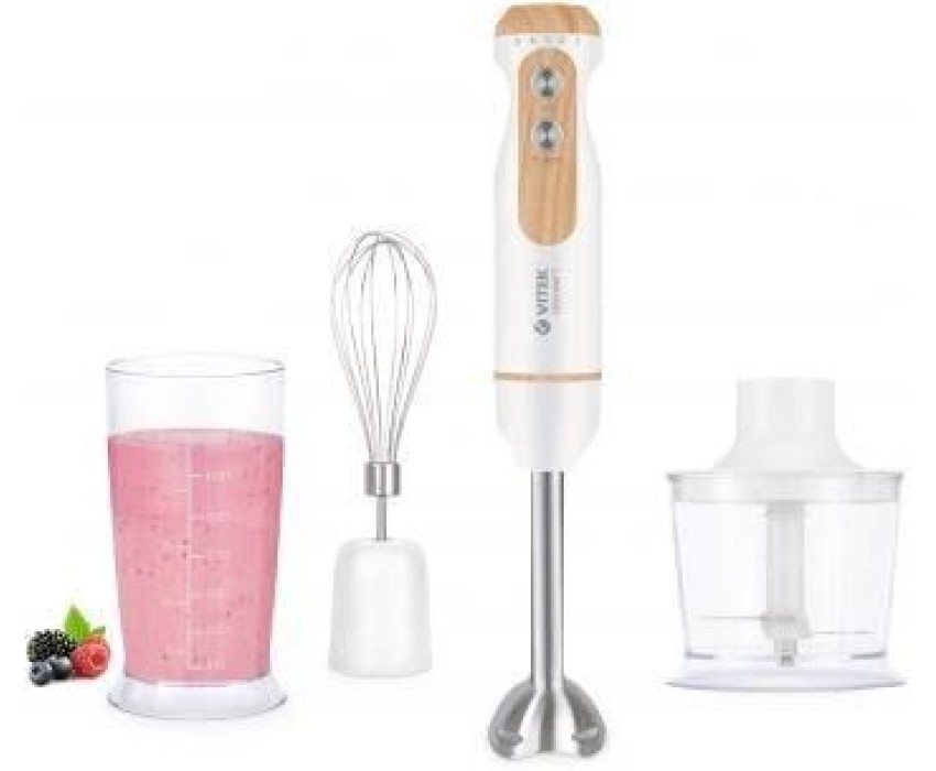 Блендер погружной. Мощность: 1200 вт, Количество скоростей: 5, Турборежим, Плавная регулировка скорости, Управление: механическое, Материал корпуса: пластик, Материал погружной части: нержавеющая сталь, Емкость измельчителя: 500 мл, Емкость мерного стакана: 700 мл, Венчик для взбивания, Мерный стакан, Длина сетевого шнура: 130см, Измельчитель, Цвет: Белый/ольха