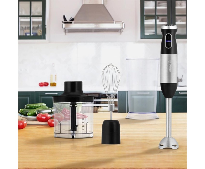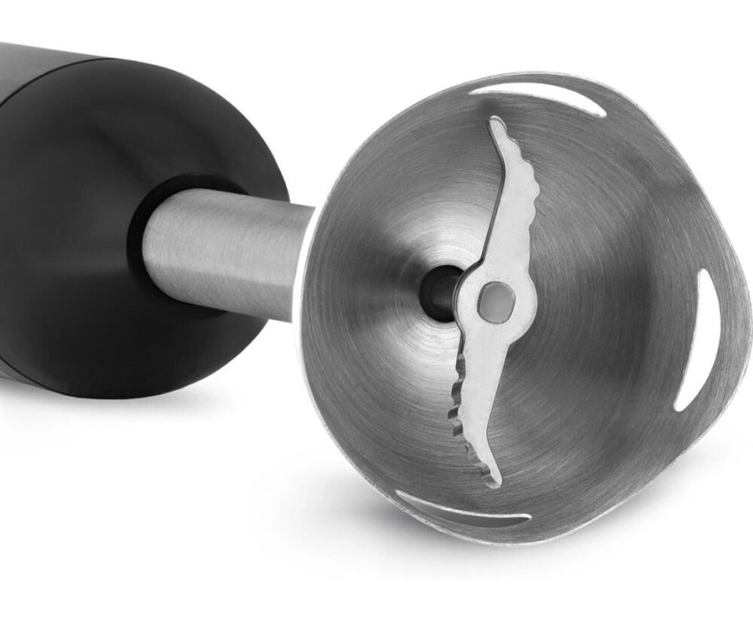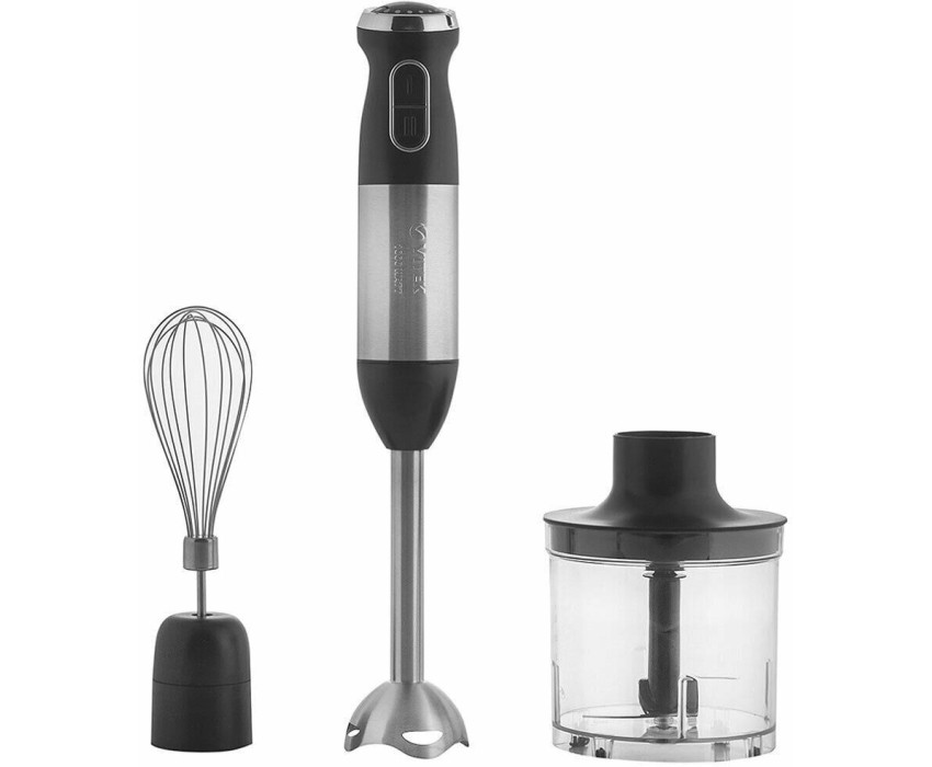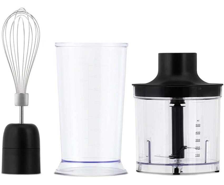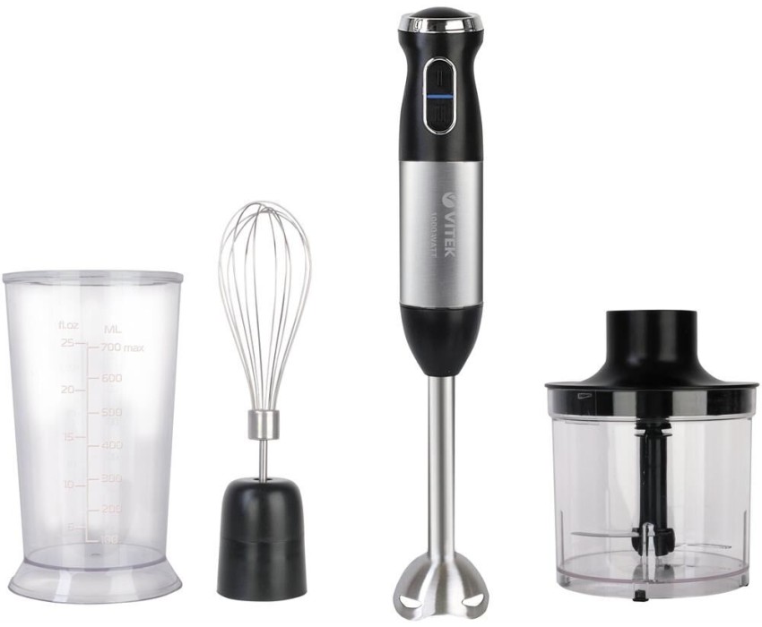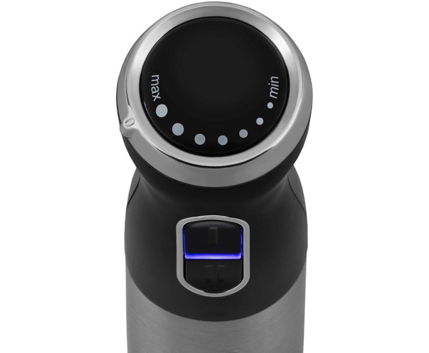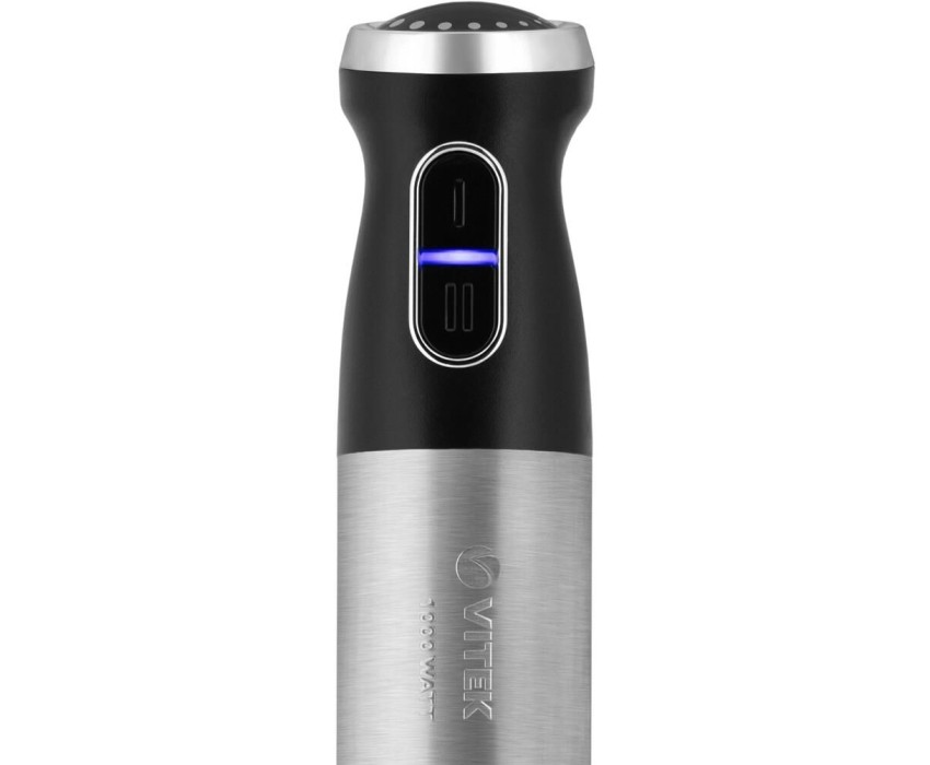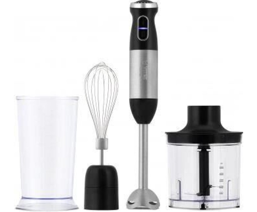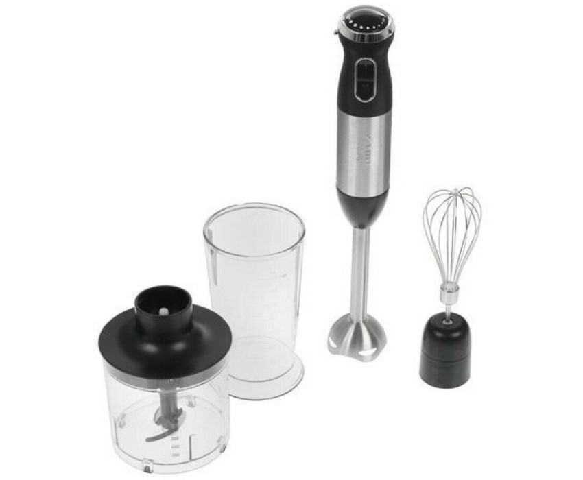 Блендер погружной. Мощность: 1000 Вт Материал погружной части: нержавеющая сталь Скоростей/режимов: плавная регулировка скорости Насадки: измельчитель, венчик для взбивания Чаша: 0.5 л, пластик Режимы: турборежим. Цвет: Черный/серебро