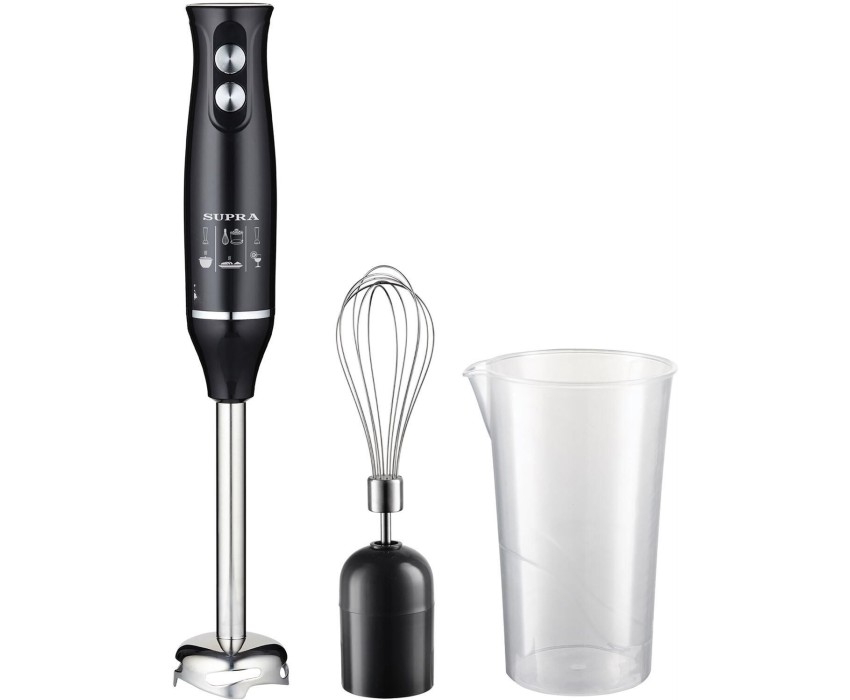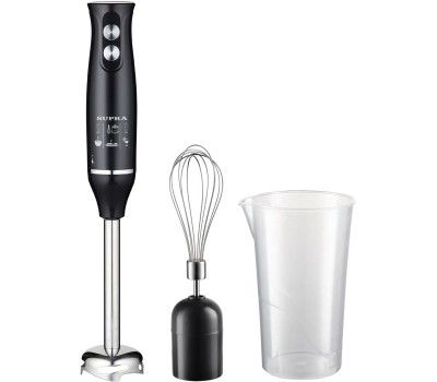 Блендер погружной, максимальная мощность: 1400 ватт, 2скорости (включая ТУРБО режим), двигатель с пониженной вибрацией и уровнем шума, мерный стакан: 700 мл, нож блендера из нержавеющей стали. Насадка-венчик из нержавеющей стали