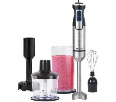 Тип: блендерный набор; Мощность: 1500Вт, DC мотор; Режимы работы: 2 скорости работы: нормальная скорость с дополнительной регулировкой и турбо-скорость; Комплектация: насадка-венчик для взбивания, насадка-чоппер (0,5л), насадка для картофельного пюре, градуированный стакан (0,6л) с силиконовой крышкой-подставкой; Цвет: черный / стальной; Материал: нержавеющая сталь, пластик, силикон; LED подсветка; Длина шнура 100см